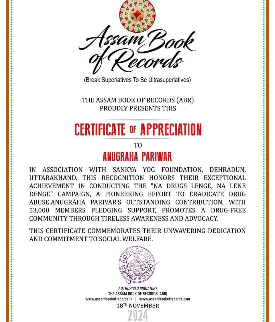 53,000 युवाओं को”ना ड्रग्स लेंगे ना लेने देंगे”अभियान के तहत शपथ दिलाने के लिए सांख्य योग फाउंडेशन और अनुग्रह परिवार को “असम बुक ऑफ रिकॉर्ड” से नवाजा गया है।