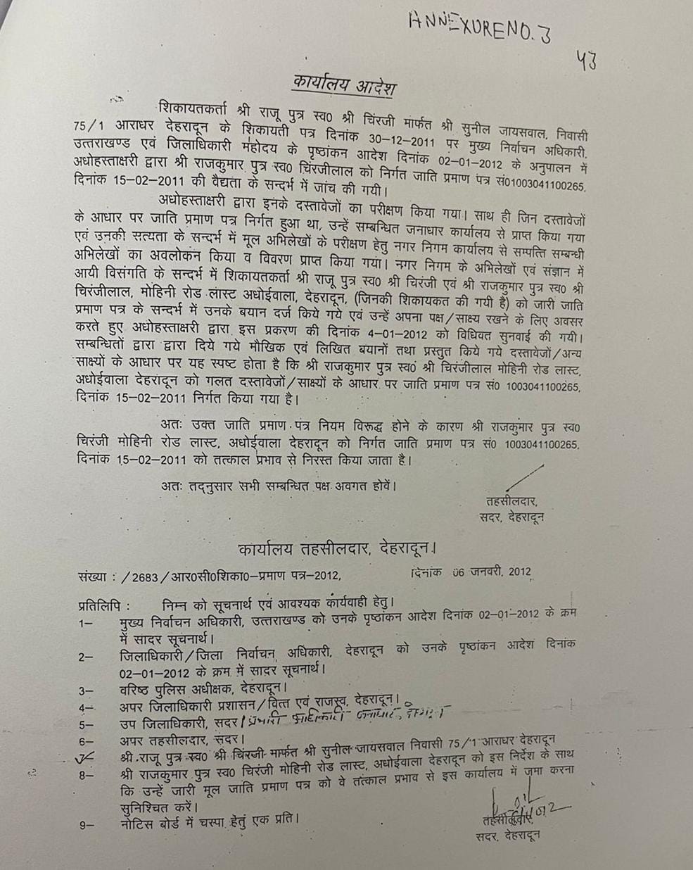उत्तराखण्ड की हॉट सीट मॉन जानी वाली 19 राजपुर से विधायक रह चुके एवं वर्तमान में कांग्रेस अनुसूचित जाति विभाग के प्रदेश अध्यक्ष राजकुमार के जाति प्रमाण पत्र पर एक बार फिर से सवाल उठाए गए हैं।