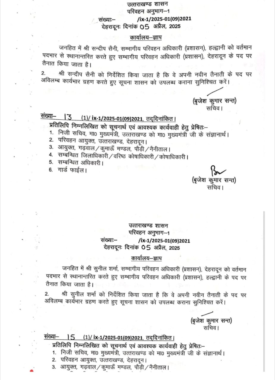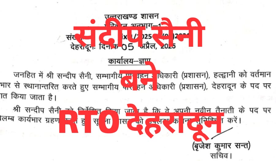 संभागीय परिवहन अधिकारी (प्रशासन) संदीप सैनी को आरटीओ (प्रशासन) देहरादून की जिम्मेदारी सौंपी गई है। इसके साथ ही देहरादून में संभागीय परिवहन अधिकारी (प्रशासन) सुनील शर्मा को इसी पद पर हल्द्वानी भेजा गया है।