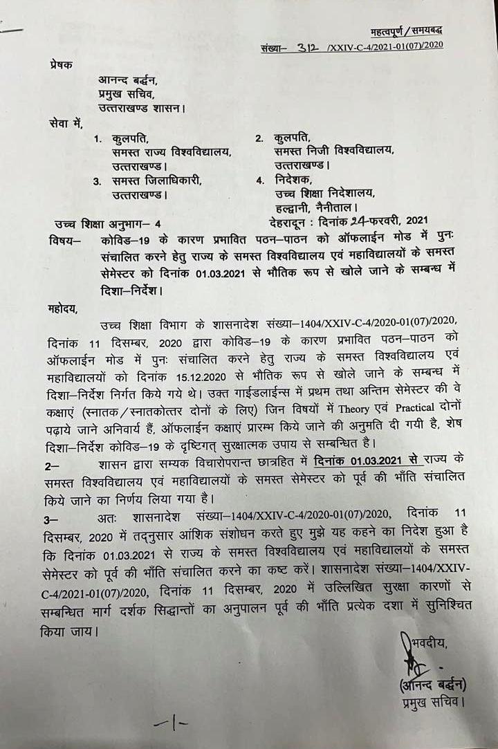 उच्च शिक्षा विभाग के शासनादेश में 11 दिसम्बर, 2020 को कोविड-19 के कारण प्रभावित पठन-पाठन को ऑफलाईन मोड में पुनः संचालित करने हेतु राज्य के समस्त विश्वविद्यालय एवं महाविद्यालयों को 15.12.2020 से भौतिक रूप से खोले जाने के सम्बन्ध में दिशा-निर्देश निर्गत किये गये थे। इस गाईडलाईन्स में प्रथम तथा अन्तिम सेमेस्टर की वे कक्षाएं (स्नातक/स्नातकोत्तर दोनों के लिए) जिन विषयों में Theory एवं Practical दोनों पढ़ाये जाने अनिवार्य हैं, ऑफलाईन कक्षाएं प्रारम्भ किये जाने की अनुमति दी गयी है, शेष दिशा-निर्देश कोविड-19 के दृष्टिगत् सुरक्षात्मक उपाय से सम्बन्धित है ।