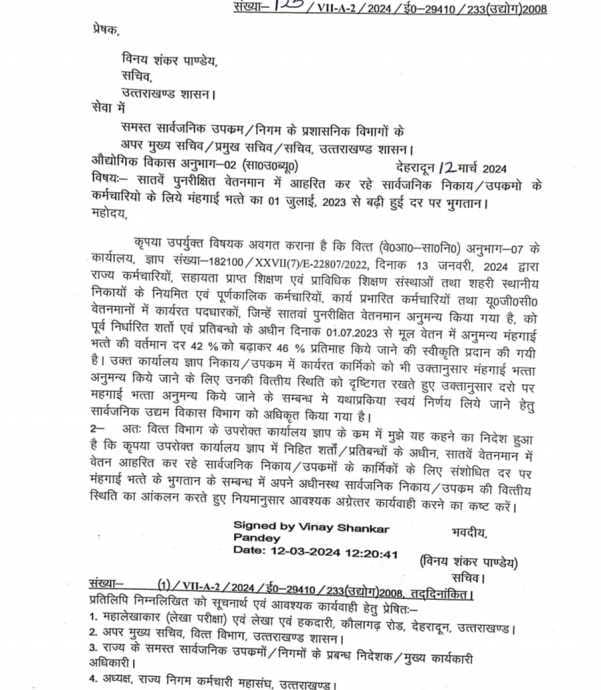 कृपया उपर्युक्त विषयक अवगत कराना है कि वित्त (वे०आ०- सा०नि०) अनुभाग-07 के कार्यर्यालय, ज्ञाप संख्या-182100/XXVII(7)/E-22807/2022, दिनाक 13 जनवरी, 2024 द्वारा राज्य कर्मचारियों, सहायता प्राप्त शिक्षण एवं प्राविधिक शिक्षण संस्थाओं तथा शहरी स्थानीय निकायों के नियमित एवं पूर्णकालिक कर्मचारियों, कार्य प्रभारित कर्मचारियों तथा यू०जी०सी० वेतनमानों में कार्यरत पदधारकों, जिन्हें सातवां पुनरीक्षित वेतनमान अनुमन्य किया गया है,को पूर्व निर्धारित शर्तों एवं प्रतिबन्धो के अधीन दिनाक 01.07.2023 से मूल वेतन में अनुमन्य मंहगाई भत्ते की वर्तमान दर 42% को बढ़ाकर 46 % प्रतिमाह किये जाने की स्वीकृति प्रदान की गयी है। उक्त कार्यालय ज्ञाप निकाय / उपक्रम में कार्यरत कार्मिको को भी उक्तानुसार मंहगाई भत्ता अनुमन्य किये जाने के लिए उनकी वित्तीय स्थिति को दृष्टिगत रखते हुए उक्तानुसार दरो पर महगाई भत्ता अनुमन्य किये जाने के सम्बन्ध मे यथाप्रकिया स्वयं निर्णय लिये जाने हेतु सार्वजनिक उद्यम विकास विभाग को अधिकृत किया गया है।