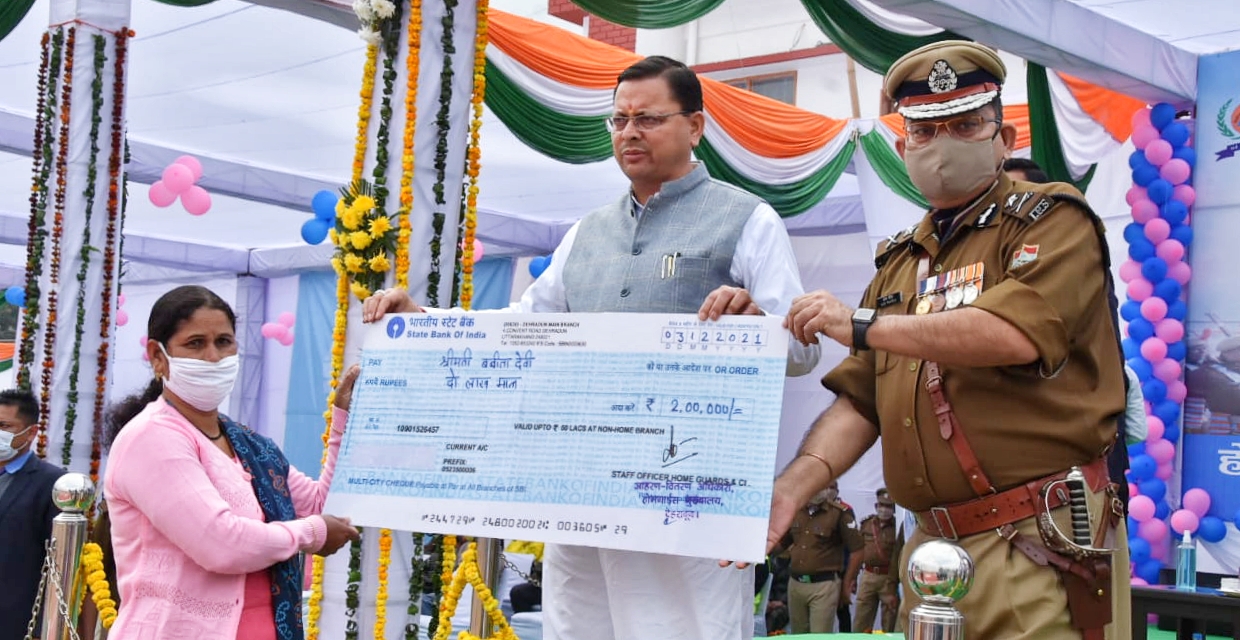 इस अवसर पर मुख्यमंत्री ने घोषणा की कि कोविड के दौरान लगातार कोविड ड्यूटी में तैनात सभी होमगार्ड्स जवानों को 6000 रूपये की एकमुश्त प्रोत्साहन राशि दी जाएगी। मुख्यमंत्री ने इस दौरान केन्द्रीय प्रशिक्षण संस्थान थानो के छात्रावास तथा जिला कमांडेंट होमगार्ड कार्यालय, हरिद्वार का लोकार्पण भी किया।