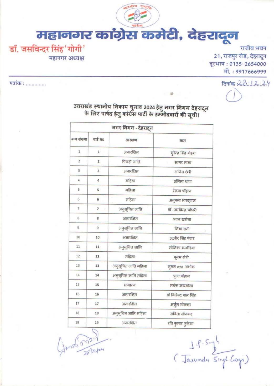 भाजपा की लिस्ट के बाद देहरादून के पार्षद प्रत्याशियों लिस्ट भी जारी हो ही गई,पार्टी ने संभवतः बिना किसी एक्सपेरिमेंट के पारंपरिक प्रत्याशी ही मैदान में उतारे गए हैं। महानगर अध्यक्ष के रूप में डॉ.गोगी की अग्निपरीक्षा होगी। देखना होगा कि दावे पर दावे कर रही कांग्रेस सत्ताधारी बीजेपी पार्टी के आगे खुद को कितना बूस्ट अप कर पाती है।