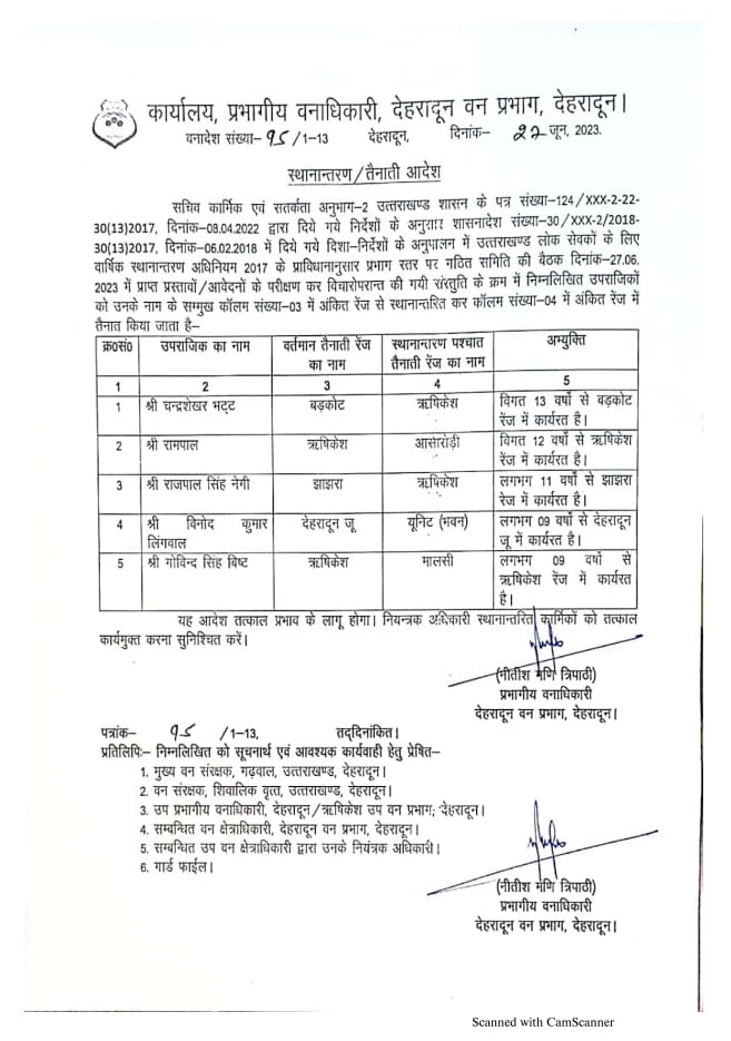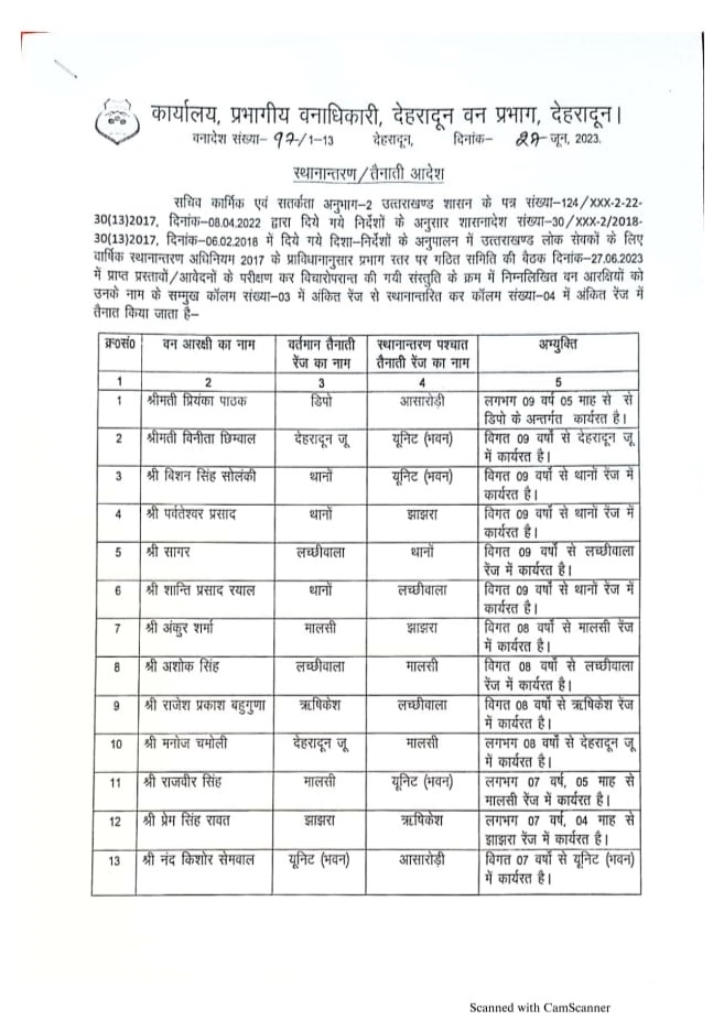 हालांकि , बीते नौ सालों से देहरादून में ही तैनात विनोद कुमार को यूनिट और ऋषिकेश में तैनात गोविंद्र सिंह बिष्ट को मालसी ट्रांसफर किया गया है। वन दरोगा सुनील कुमार भट्ट जो कि 14 सालों से थानो रेंज में तैनात थे। उन्हें आशारोड़ी रेंज में ट्रांसफर किया गया है। इसी तरह 13 सालों से भी ज्यादा समय से थानो रेंज में ही तैनात रहे माधव सिंह पंवार को लच्छीवाला भेजा गया है।