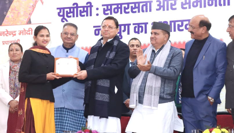सोमवार को सीएम आवास स्थित मुख्य सेवक सदन में आयोजित समारोह में मुख्यमंत्री पुष्कर सिंह धामी ने विधिवत तौर पर समान नागरिक संहिता की अधिसूचना का अनावरण, यूसीसी पोर्टल ucc.uk.gov.in का भी शुभारंभ और यूसीसी नियमावली बुकलेट का विमोचन किया। यूसीसी पोर्टल पर मुख्यमंत्री ने सबसे पहले अपने विवाह का पहला पंजीकरण कराया, जिसका प्रमाणपत्र मुख्य सचिव राधा रतूड़ी ने मुख्यमंत्री को सौंपा। इस अवसर पर मुख्यमंत्री ने यूसीसी के तहत सर्वप्रथम पंजीकरण कराने वाले पांच आवेदकों को भी प्रमाणपत्र प्रदान किए।
