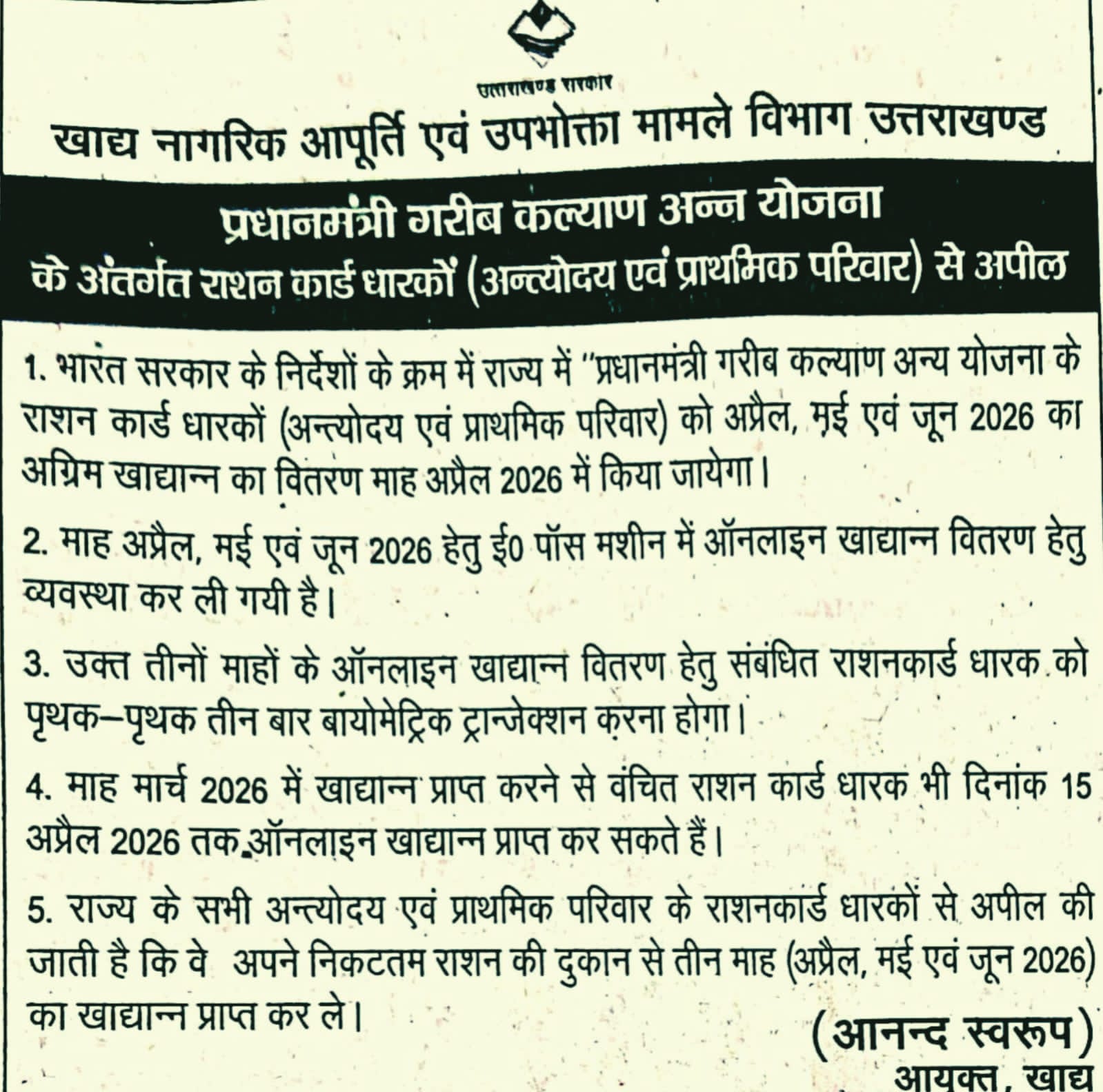 अब उत्तराखंड में भी प्रधानमंत्री गरीब कल्याण अन्न योजना (PMGKAY) के तहत अंत्योदय और प्राथमिक राशन कार्ड धारकों को अप्रैल, मई और जून 2026 के लिए मुफ्त खाद्यान्न का वितरण अप्रैल 2026 में ही एक साथ किया जाएगा।