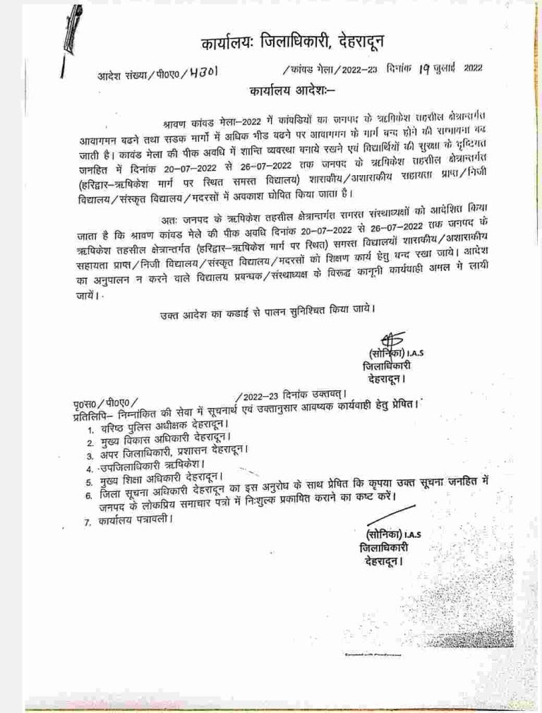 उत्तराखंड में कावड़ यात्रा के चलते जहां हरिद्वार जनपद की स्कूल 20 जुलाई से 26 जुलाई तक बंद रहेंगे वही देहरादून जिला अधिकारी सोनिका ने भी ऋषिकेश तहसील क्षेत्र के अंतर्गत पढ़ने वाले स्कूलों में भी 20 जुलाई से 26 जुलाई तक अवकाश घोषित कर दिया है।