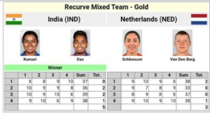 भारतीय तिकड़ी की 5 – 1 की जीत से भारत को विश्व कप के तीसरे चरण में दूसरा स्वर्ण पदक मिला। इससे पहले शनिवार को कंपाउंड व्यक्तिगत स्पर्धा में अभिषेक वर्मा ने भारत के लिए पहला स्वर्ण पदक जीता था।