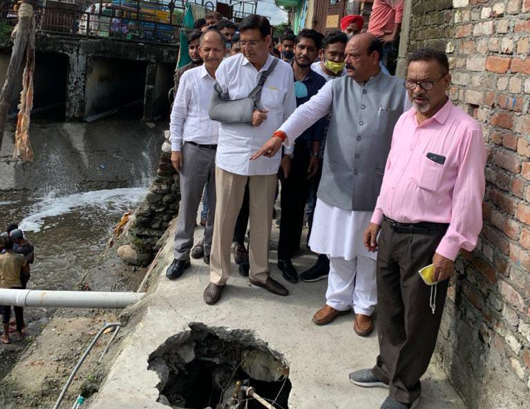 नेता प्रतिपक्ष प्रीतम सिंह ने कैन्ट विधानसभा के गांधी ग्राम में कल्याण आश्रम पुल के पास पुस्ता ढहने से हुए नुकसान का जायजा लिया।