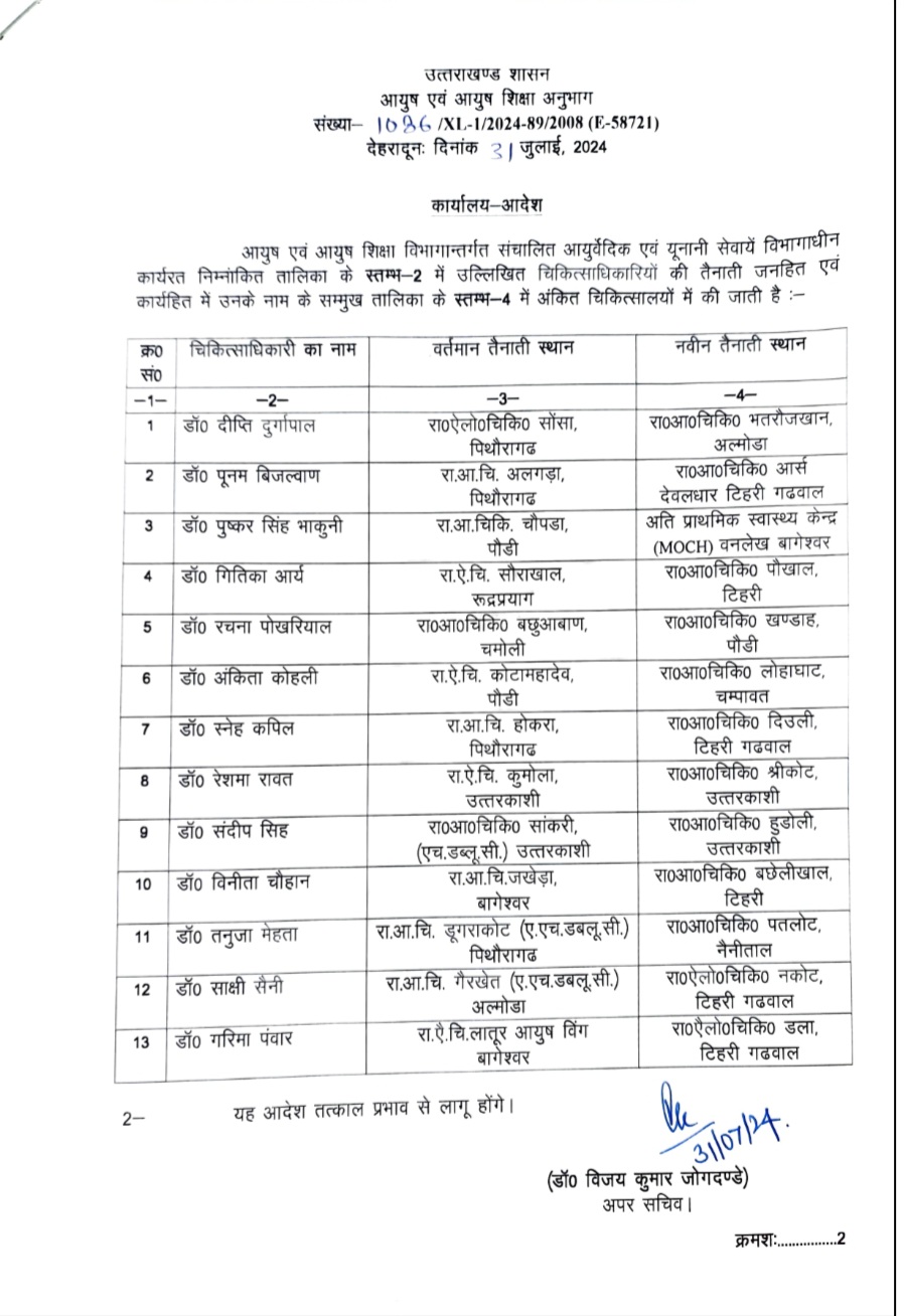 प्रदेश में चिकित्सा अधिकारियों को लेकर सूची जारी की गई है। शासन द्वारा जारी की गई सूची में आयुष एवं आयुष शिक्षा विभागान्तर्गत संचालित आयुर्वेदिक एवं यूनानी सेवायें विभागाधीन कार्यरत निम्नांकित तालिका के स्तम्भ-2 में उल्लिखित चिकित्साधिकारियों की तैनाती जनहित एवं कार्यहित में उनके नाम के सम्मुख तालिका के स्तम्भ 4 में अंकित चिकित्सालयों में की जाती है,साथ ही तत्काल रूप से ज्वाइनिंग करने के निर्देश भी जारी किए गए हैं,आप भी देखिए लिस्ट …