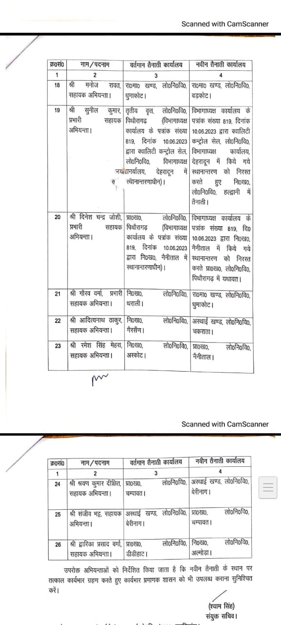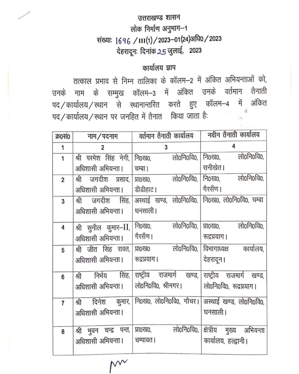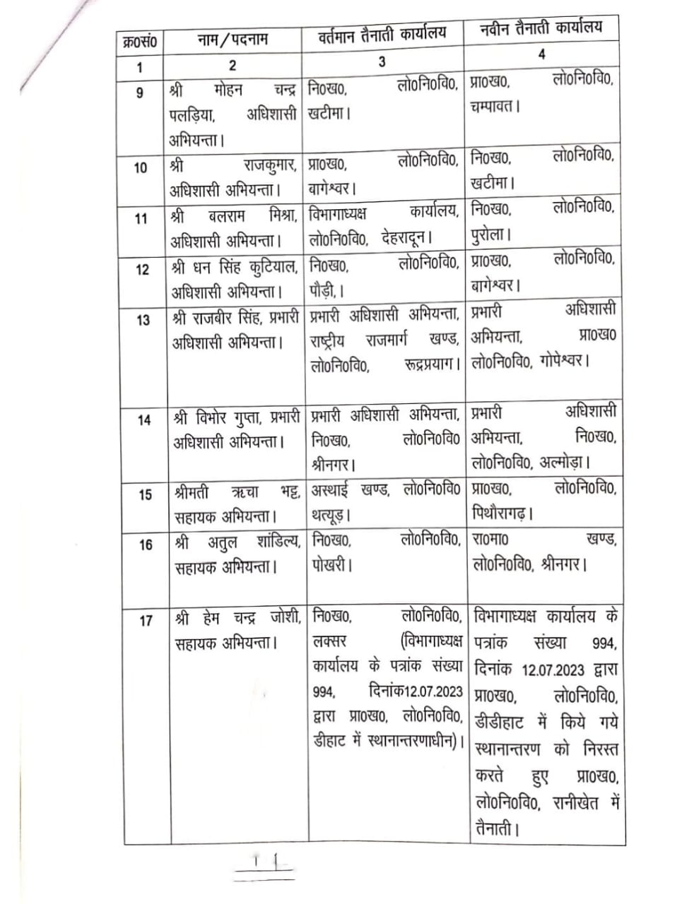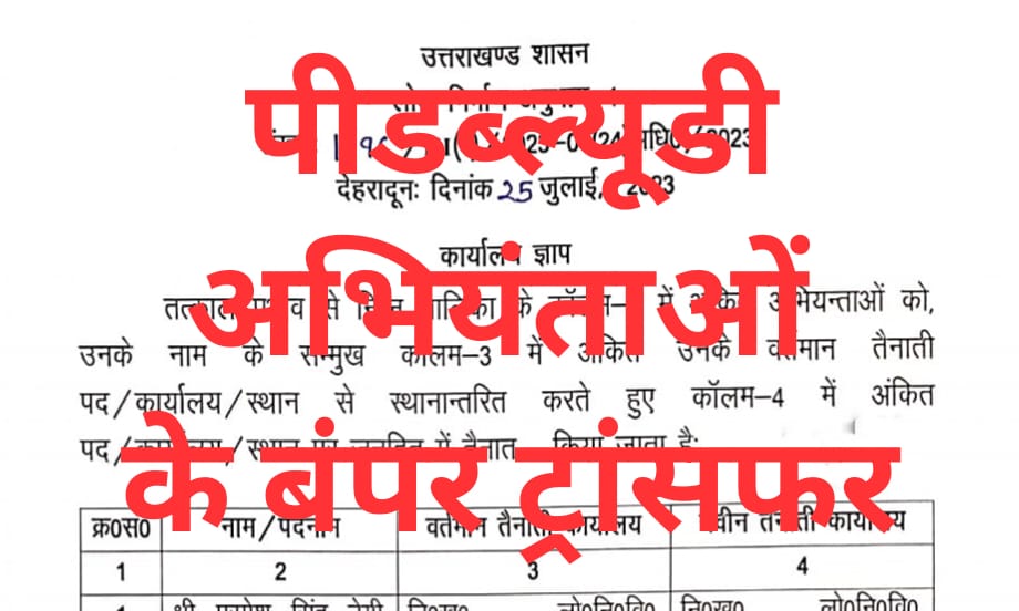 लोक निर्माण विभाग में 28 अभियंताओं के स्थानांतरण की लिस्ट जारी की गई है। जिनको तत्काल अपने तैनाती स्थल पर ज्वाइनिंग के आदेश भी जारी किए गए हैं।