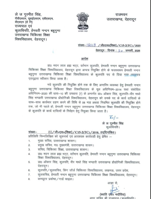 डा० मदन लाल ब्रह्म भट्ट, वर्तमान कुलपति, हेमवती नन्दन बहुगुणा उत्तराखण्ड चिकित्सा शिक्षा विश्वविद्यालय, देहरादून द्वारा अन्यत्र नियुक्ति होने के फलस्वरूप हेमवती नन्दन बहुगुणा उत्तराखण्ड चिकित्सा शिक्षा विश्वविद्यालय के कुलपति पद से दिया गया त्यागपत्र एततद्वारा स्वीकार किया जाता है।