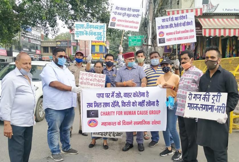 आज महाकाल के दीवाने सामाजिक संस्था एवं चैरिटी फ़ॉर ह्यूमन कॉज ग्रुप देहरादून के संयुक्त प्रयास से आम जनता को जागरूक करने के लिए होर्डिंग/ स्लोगन पोस्टर द्वारा घंटाघर पर एक जागरूकता अभियान चलाया गया जिसमे मुफ्त मास्क का वितरण किया गया आम जनता के हाथों को सैनिटाइज किया एवं आमजन से अपील की की मास्क लगाए एवं सोशल डिस्टेंस का पालन बेहद जरूरी हैं ।