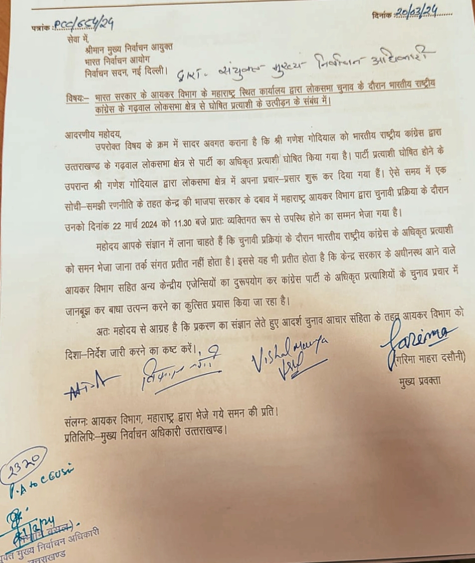 अखिल भारतीय राष्ट्रीय कांग्रेस के गढ़वाल संसदीय क्षेत्र से प्रत्याशी गणेश गोदियाल पर इनकम टैक्स विभाग ,महाराष्ट्र द्वारा सम्मन दिए जाने और उत्पीड़न करने की शिकायत करते हुए ज्ञापन सौंपा है।