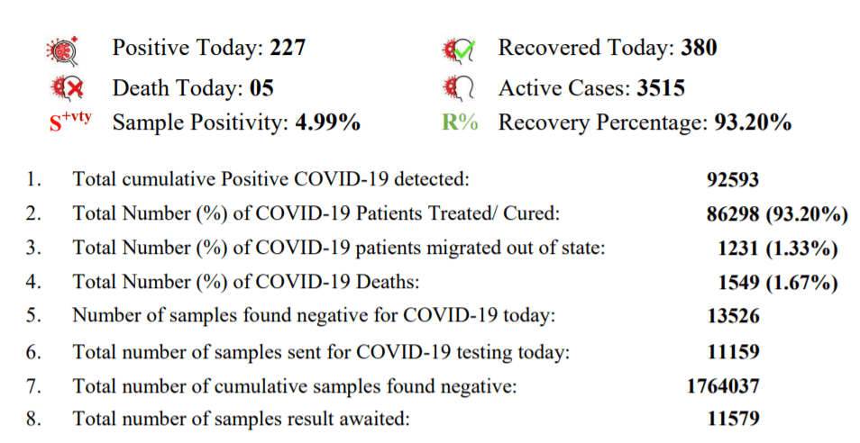 राज्य में कोरोना पॉजिटिव मरीजों का कुल आंकड़ा 92593 हो गया है।