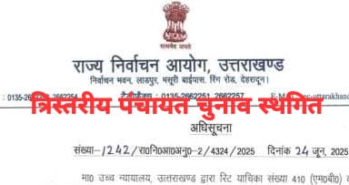 उच्च न्यायालय, उत्तराखण्ड द्वारा रिट याचिका संख्या 410 (एम०बी०) वर्ष 2025 गणेश दत्त काण्डपाल बनाम उत्तराखण्ड राज्य एवं अन्य में दिनांक 23.06.2025 को आदेश पारित किया गया कि त्रिस्तरीय पंचायत निर्वाचन हेतु राज्य सरकार द्वारा आरक्षण की नियमावली का प्रख्यापन विधिवत अधिसूचित न होने के कारण उक्त नियमावली के अनुपालन में आरक्षण का निर्धारण एवं इसके अनुसार की गई सम्पूर्ण कार्यवाही अग्रिम आदेशों तक स्थगित की जाती है।