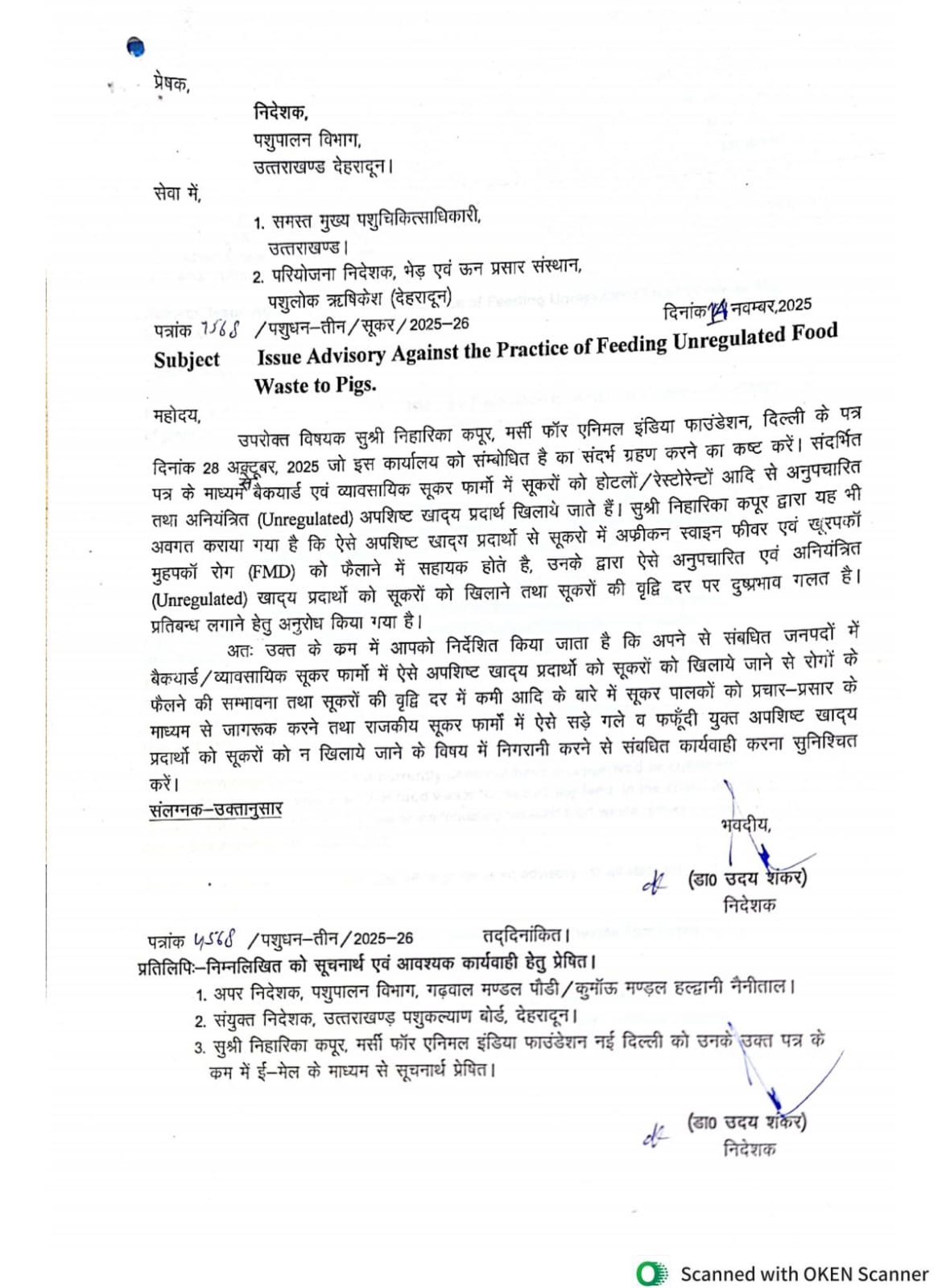 मर्सी फॉर एनिमल्स इंडिया’ (MFA) के अनुरोध के बाद, पशुपालन निदेशालय, उत्तराखंड ने सभी जिलों के मुख्य पशु चिकित्सा अधिकारियों को एक महत्वपूर्ण परामर्श जारी किया है।