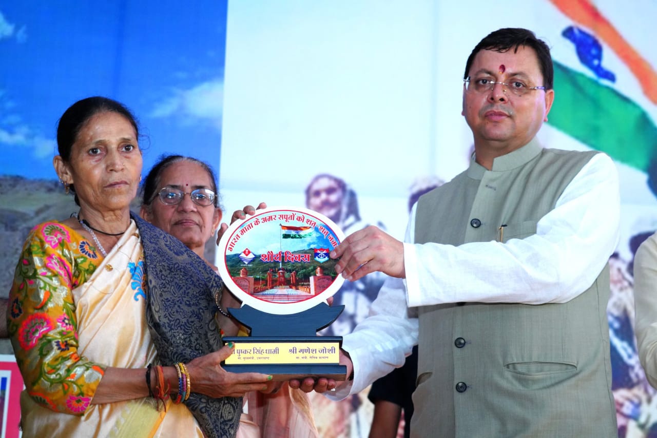 मुख्यमंत्री ने कहा कि देहरादून के गुनियालगाँव में शहीदों की स्मृति में अत्याधुनिक एवं विभिन्न सुविधाओं से युक्त ’शौर्य स्थल (सैन्य धाम) का निर्माण किया जा रहा है, जिसका निर्माण कार्य तेजी से किया जा रहा । उत्तराखण्ड सरकार द्वारा युद्ध विधवा एवं युद्ध अपंग सैनिकों को दो लाख रुपये की आवासीय सहायता प्रदान की जा रही है। उत्तराखण्ड में सेवारत एवं पूर्व सैनिकों को 25 लाख मूल्य की सम्पत्ति के खरीद पर स्टाम्प ड्यूटी में 25 प्रतिशत की छूट अनुमन्य की गयी है ।