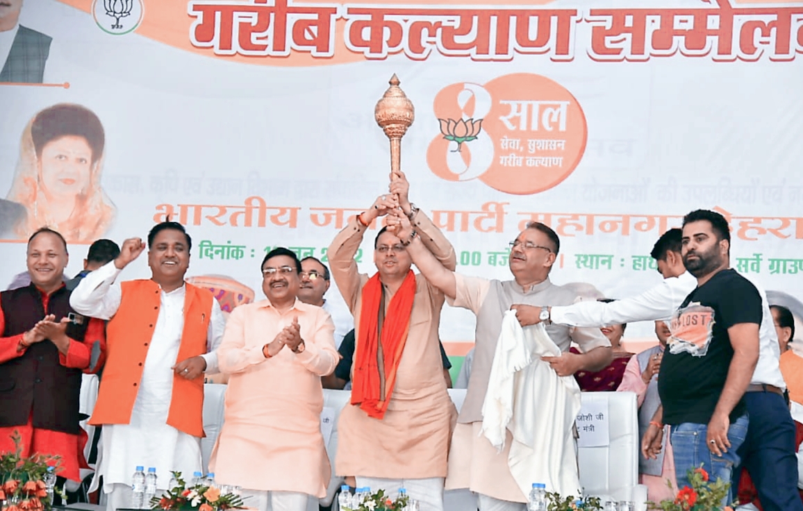 मुख्यमंत्री पुष्कर सिंह धामी ने रविवार को सर्वे स्टेडियम, हाथीबड़कला में प्रधानमंत्री नरेन्द्र मोदी के नेतृत्व में 8 वर्ष पूर्ण होने के अवसर पर आयोजित गरीब कल्याण सम्मेलन को सम्बोधित किया। इस कार्यक्रम में आजादी के अमृत महोत्सव के उपलक्ष्य में ग्राम्य विकास, उद्यान, कृषि विभाग से सम्बन्धित योजनाओं एवं कार्यक्रमों के 30 स्टॉल लगाये जाने के साथ ही बड़ी संख्या में लाभार्थी एवं स्थानीय जनता उपस्थित रही।