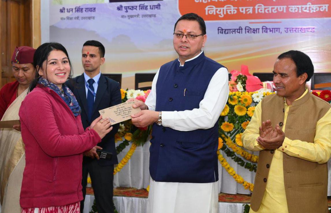 मुख्यमंत्री पुष्कर सिंह धामी एवं शिक्षा मंत्री डॉ. धन सिंह रावत द्वारा मुख्यमंत्री आवास स्थित मुख्य सेवक सदन में 05 विषयों के चयनित सहायक अध्यापकों (एलटी) को नियुक्ति पत्र प्रदान किये। शिक्षा विभाग के अन्तर्गत 1431 सहायक अध्यापकों को नियुक्ति पत्र प्रदान किये जा रहे हैं। मुख्य सेवक सदन में 150 सहायक अध्यापकों को आज नियुक्ति पत्र प्रदान किये गये।