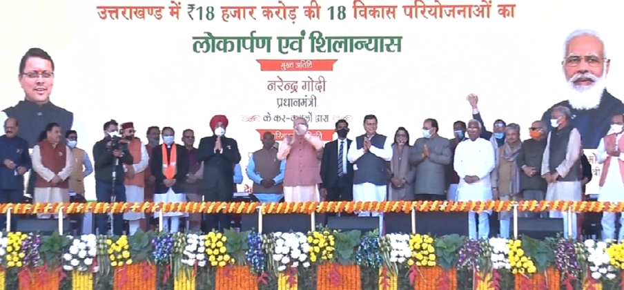 प्रधानमंत्री नरेन्द्र मोदी ने पुष्कर सिंह धामी को युवा, लोकप्रिय और ऊर्जावान मुख्यमंत्री बताते हुए कहा कि उनके नेतृत्व में उत्तराखण्ड के विकास का हर संकल्प पूरा होगा। राज्य में युवा नेतृत्व के साथ वरिष्ठ नेताओं की अनुभवी टीम है। उन्होंने कहा कि 2025 में उत्तराखण्ड अपने रजत जयंती वर्ष में विकास के नये आयाम प्राप्त करेगा। कोविड-19 के टीकाकरण अभियान में उत्तराखण्ड का देश के अग्रणी राज्यों में शामिल होने पर भी उन्होने मुख्यमंत्री पुष्कर सिंह धामी को बधाई दी। इससे पूर्व प्रधानमंत्री ने एन.एच.ए.आई. द्वारा संचालित योजनाओं के साथ ही अन्य योजनाओं पर आधारित प्रदर्शनी का भी अवलोकन किया।