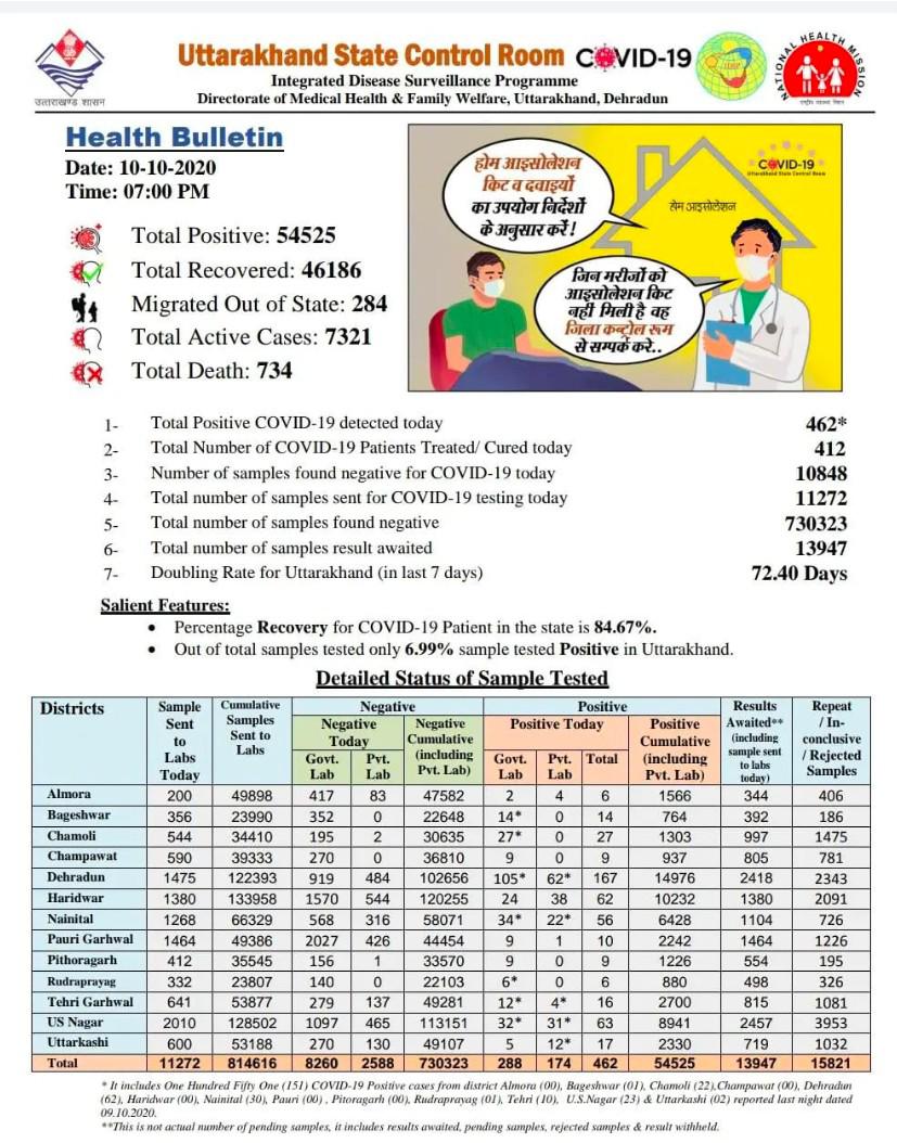उत्तराखण्ड स्वास्थ्य विभाग द्वारा जारी किये गए बुलेटिन के अनुसार रविववार को 462 और नए मरीजो में कोरोना संकमण की शिकायत मिली है।