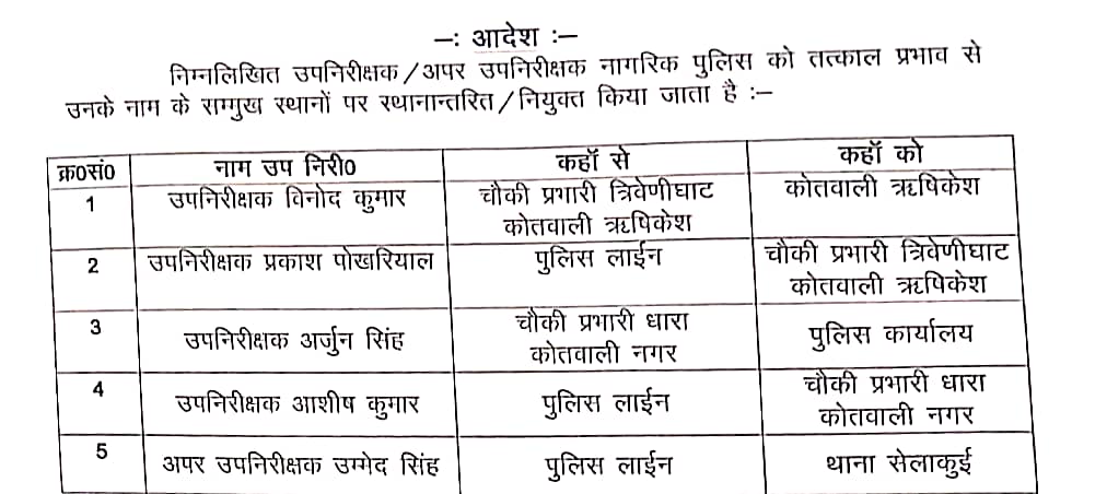 वरिष्ठ पुलिस अधीक्षक देहरादून द्वारा निम्न उप निरीक्षकों को उनके नाम के सम्मुख स्थान पर तत्काल प्रभाव से स्थानांतरित किया गया है। जिनकी लिस्ट जारी की गयी गई है।