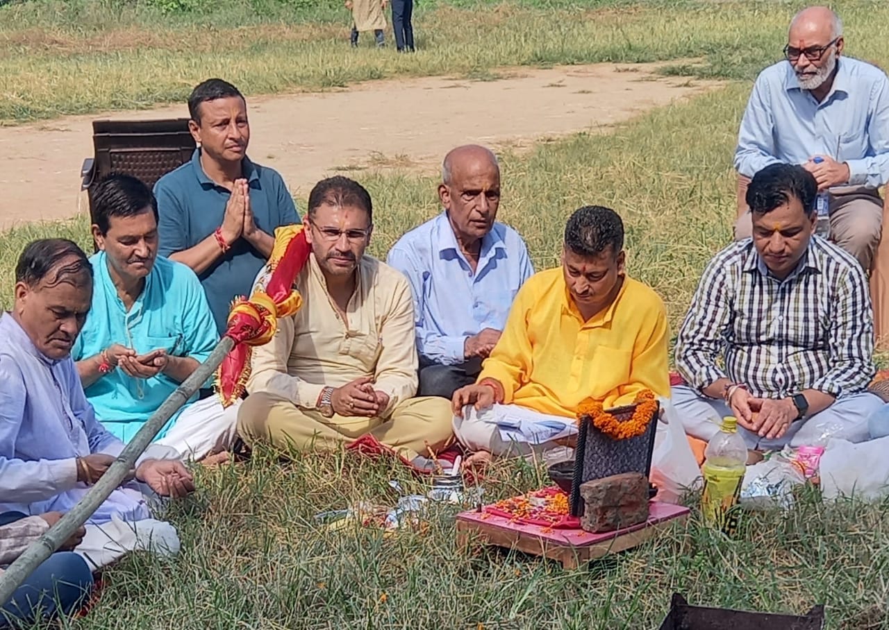 हनुमान ध्वजा स्थापना से पहले पूजा, अर्चना व हवन किया व तत्पश्चात विधि–विधान से गई।