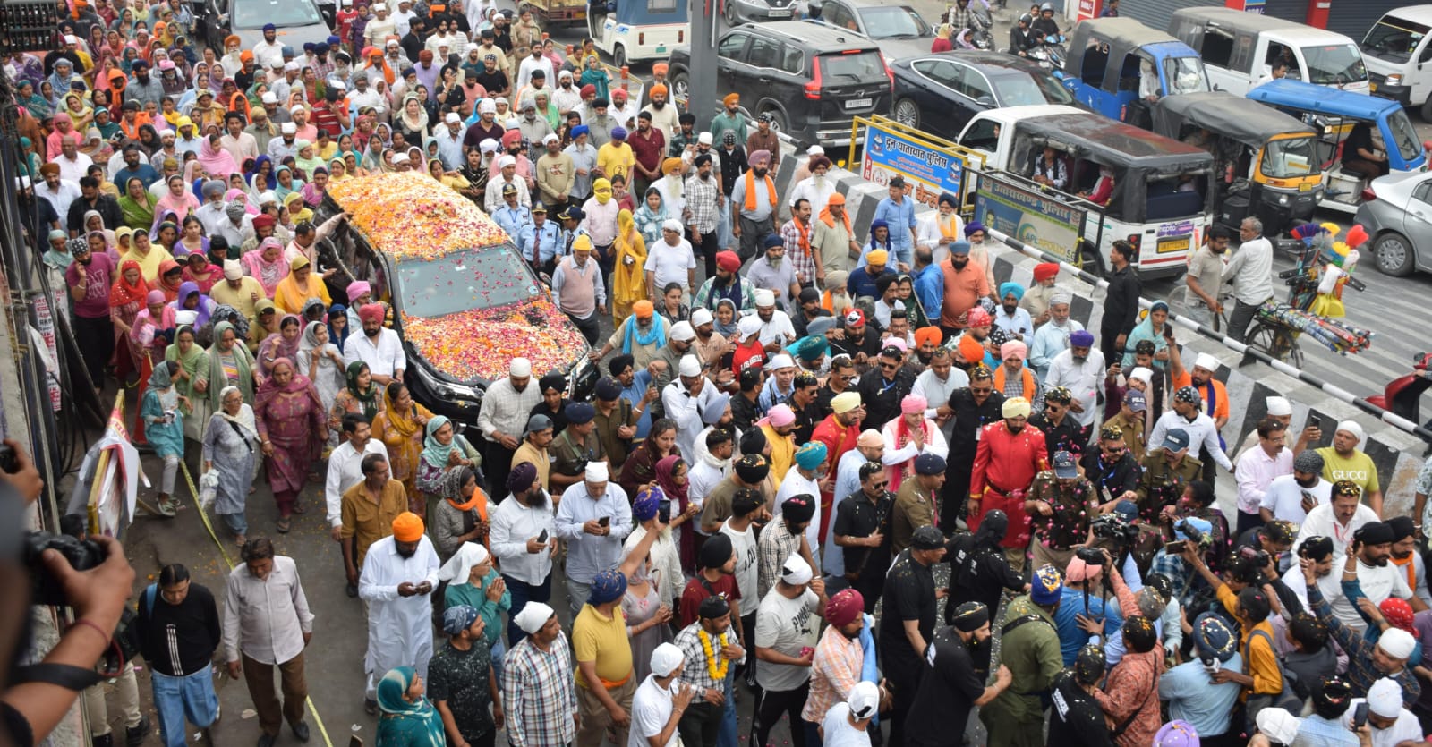 लाई-लाई-लाई-लाई-लाई बाबे ने फुलां दी बरखा लाई,आज दी घड़ी बाबा जी रोज़-रोज़ आवे, मेला खुशियां दां आंदा है हर साल मेला खुशियां दा,फुल बरसांदी जांवा राह तेरे फुल बरसांदी जांवा, फड लै मेरियां बांवा दातया फुल बरसांदी जांवा, हर इक दी ओ सुणदां, ऐसे दाता मेहर लगाई, जिन्नी करई ओनी थोडी मेरे साहिब दी बढ़याई ऐ-मेरे साहिब दी वढेआई ए , फुल बरसे फुल बरसे सारे राह बाबा जी तेरे फुल बरसे.,जैसे भजनों पर संगतों ने जमकर नृत्य किया। नगर परिक्रमा के दौरान पूरे हर्ष-उल्लास व उमंग के साथ संगत गुरु के रंग मंे रंगी दिखी। इस दौरान संगतों में भारी उत्साह देखा गया। ढोल की थाप पर संगतों ने नृत्य किया व श्री गुरु महाराज के सिमरन में भेंटें गाई गई।