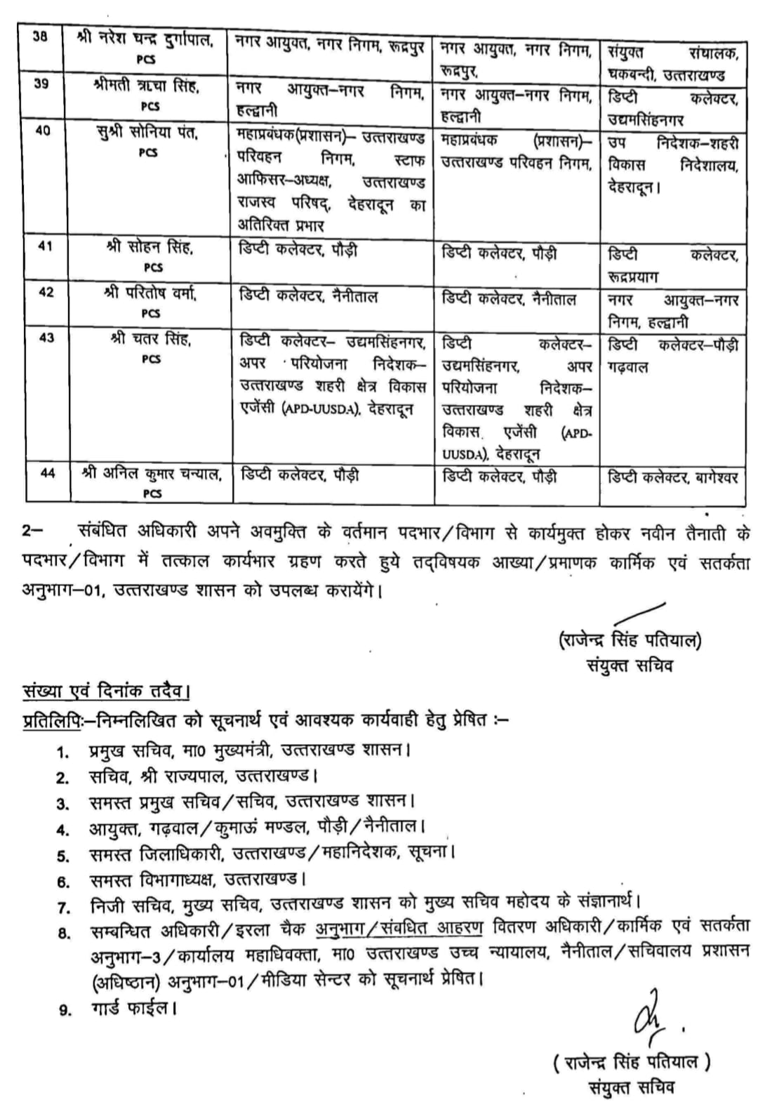 आईएएस, आईएफएस, पीसीएस व सचिवालय सेवा के 44 अधिकारियों का कार्यभार बदला गया है।