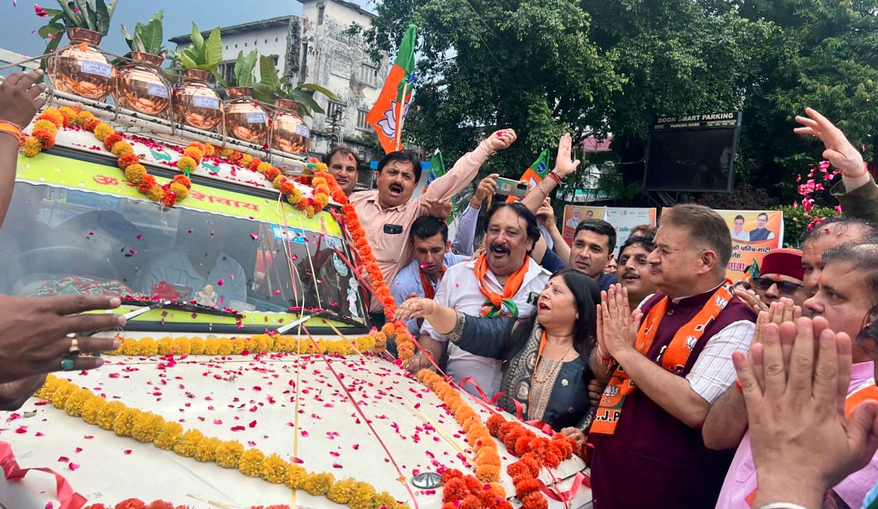 प्रदेश के सैनिक कल्याण मंत्री गणेश जोशी एवं भाजपा प्रदेश अध्यक्ष महेंद्र भट्ट ने भाजपा कार्यकर्ताओं के साथ आज देहरादून के घंटाघर में जल संग्रहण यात्रा का देहरादून पहुंचने पर पुष्प वर्षा कर यात्रा का भव्य रूप से स्वागत किया। इस अवसर पर विधायक सविता कपूर, विधायक खजान दास महानगर अध्यक्ष सिद्धार्थ अग्रवाल भी उपस्थित रहे।गौरतलब है कि 03 जुलाई यानी को उत्तराखण्ड के पंचम धाम सैन्य धाम में शहीदों के आंगन की पवित्र माटी को अमर जवान ज्योति के निर्माण में प्रतिस्थापन किया जाएगा। इसके अतिरिक्त सैन्य धाम में निर्मित होने वाले अमर जवान ज्योति के निर्माण में 1734 शहीदों के आंगन की पवित्र मिट्टी के साथ-साथ प्रदेश की सभी प्रमुख नदियों से एकत्रित पवित्र जल भी अमर जवान ज्योति के मुख्य स्तंभ की आधारशिला में अर्पित किया जाएगा। कार्यक्रम में मुख्य अतिथि राज्यपाल ले.जनरल गुरमीत सिंह (से. नि) विशिष्ट अतिथि प्रदेश के मुख्यमंत्री पुष्कर सिंह धामी, चीफ ऑफ डिफेन्स स्टॉफ जनरल अनिल चौहान तथा वीर नारियां कार्यक्रम में शामिल होंगी।