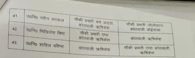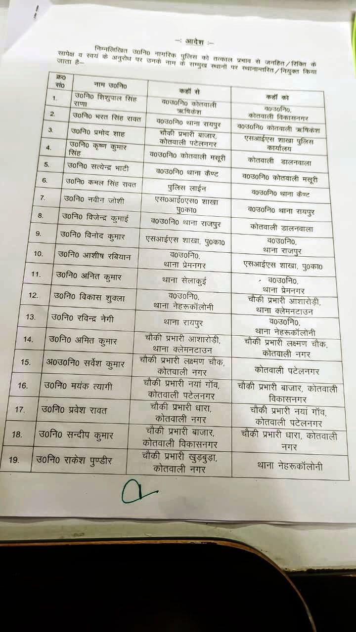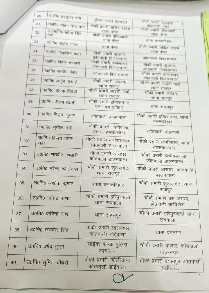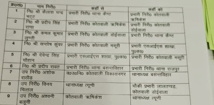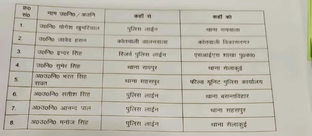 दिनांक 5/10/2025 की मध्यरात्री वरिष्ठ पुलिस अधीक्षक देहरादून अजय सिंह द्वारा निम्न निरीक्षकों/उप निरीक्षकों के स्थानांतरण करते हुए लिस्ट जारी की गई है।