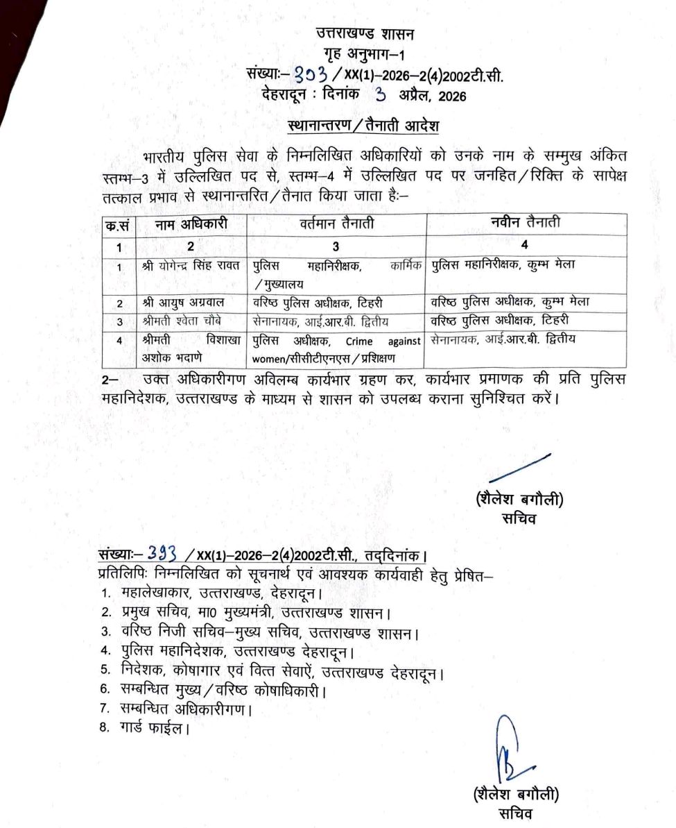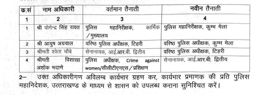 जारी किए गए शासनादेश में वरिष्ठ आईपीएस योगेन्द्र सिंह रावत के साथ ही आयुष अग्रवाल, श्वेता चौबे और विशाखा अशोक भदाने शामिल हैं।
