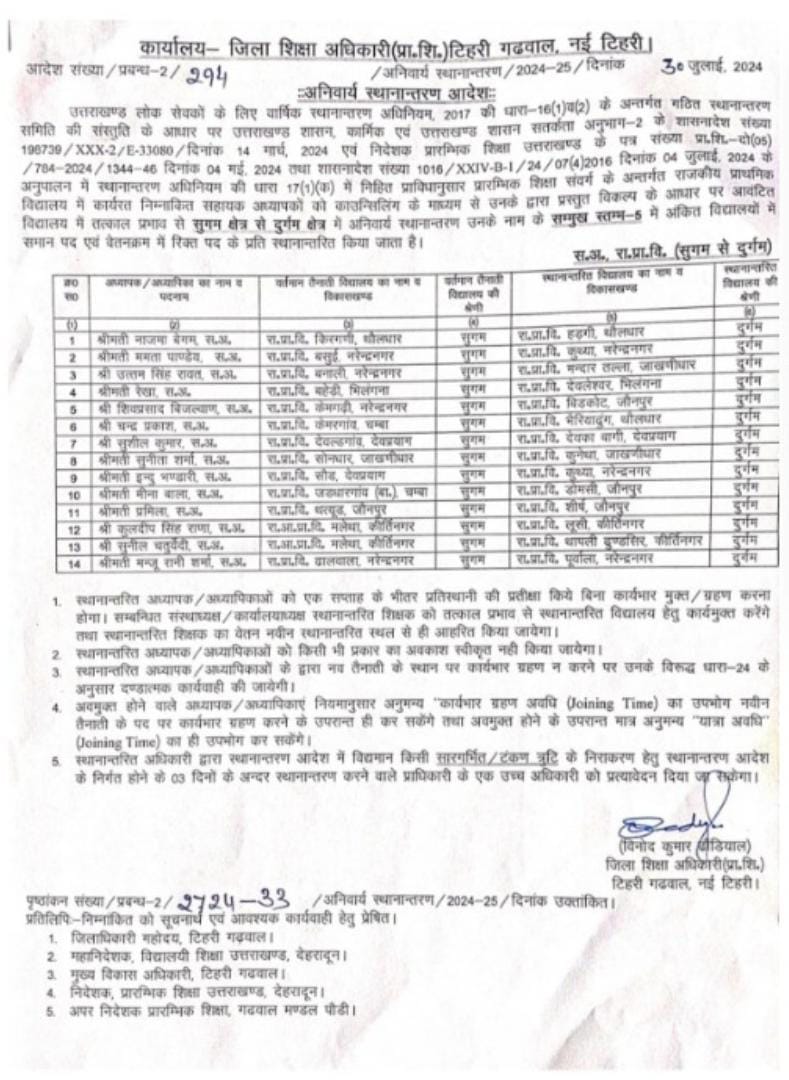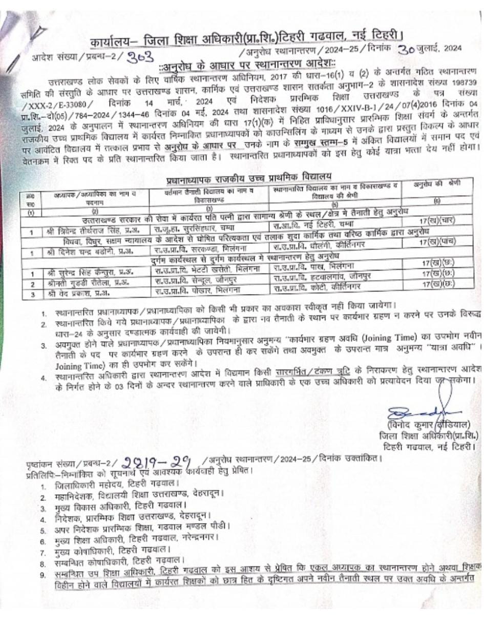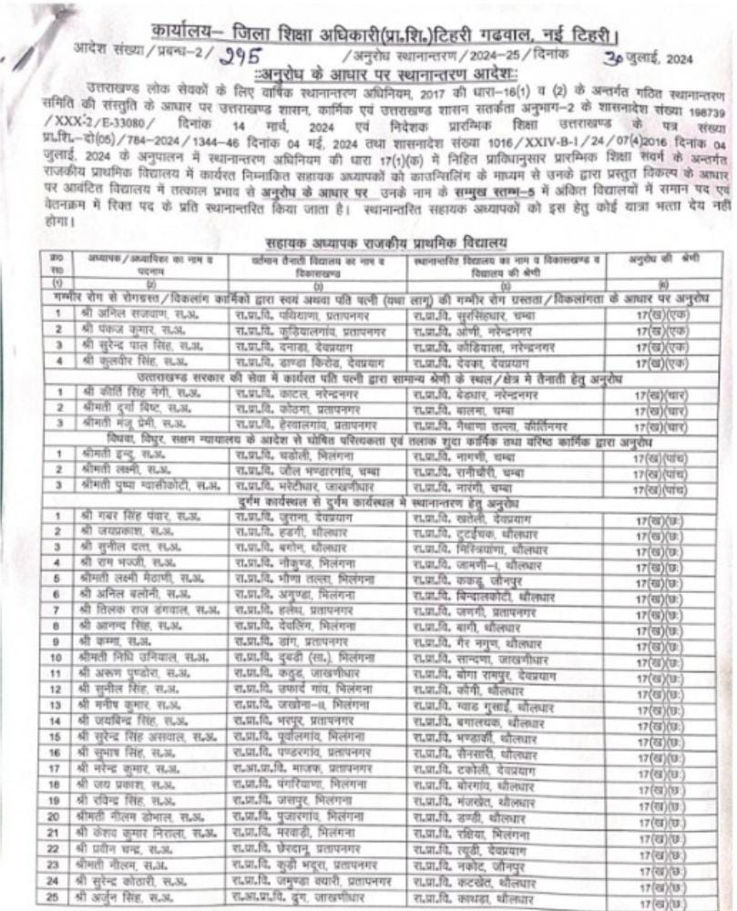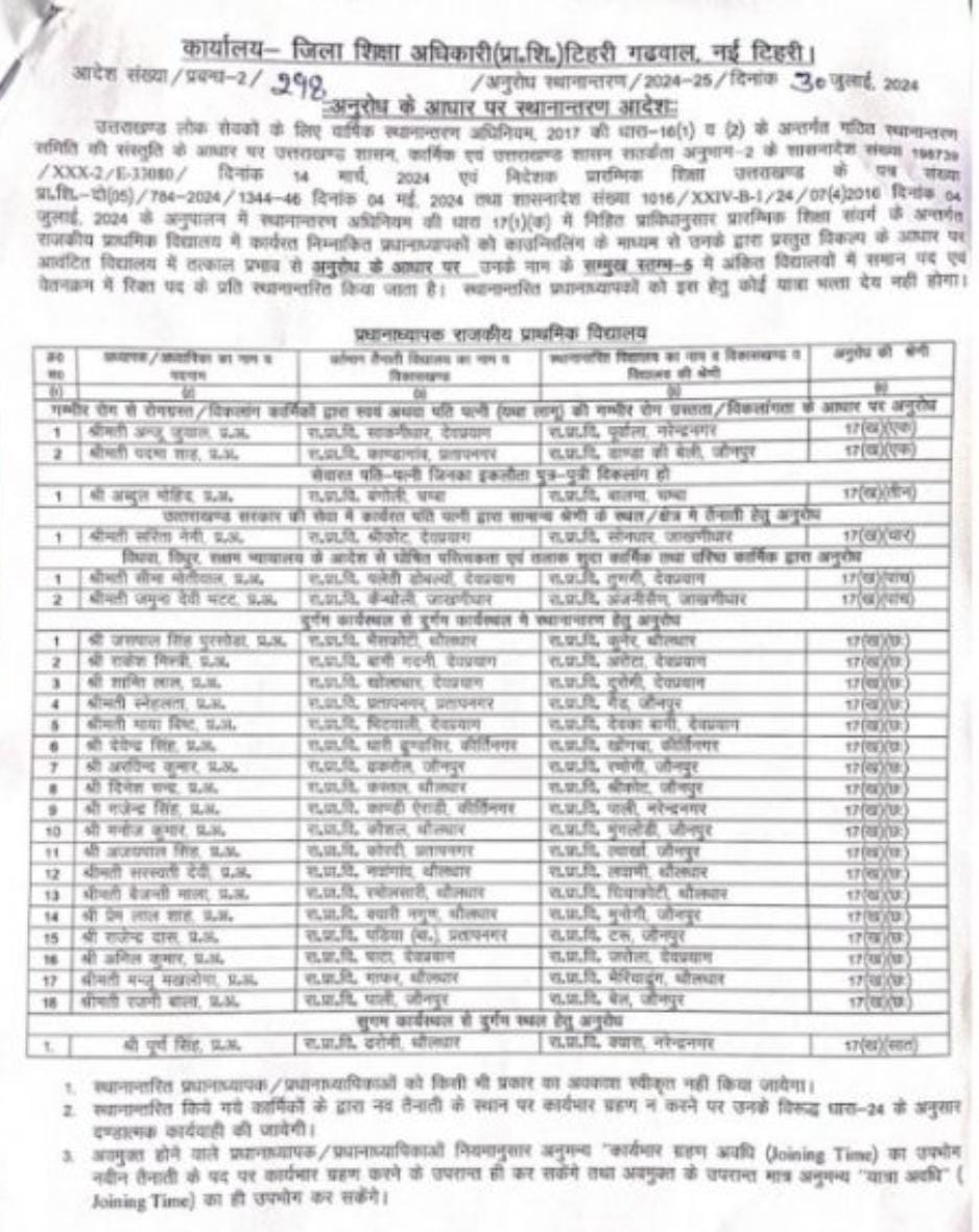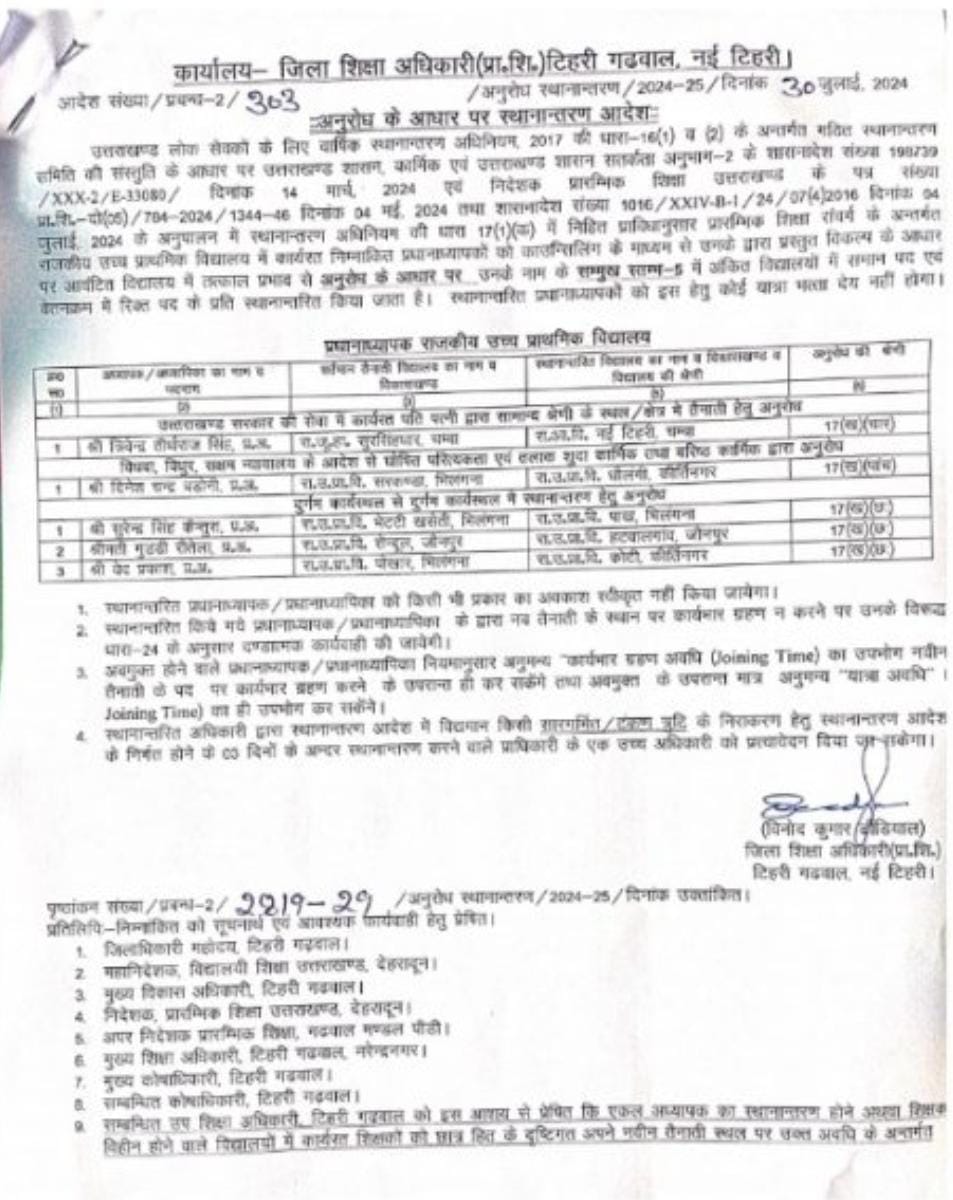 उत्तराखंड शिक्षा विभाग में हुए बंपर तबादले,प्रधानाचार्य,प्रधानाध्यापक, सहायक अध्यापक,अध्यापको के हुए तबादलों की बंपर लिस्ट..