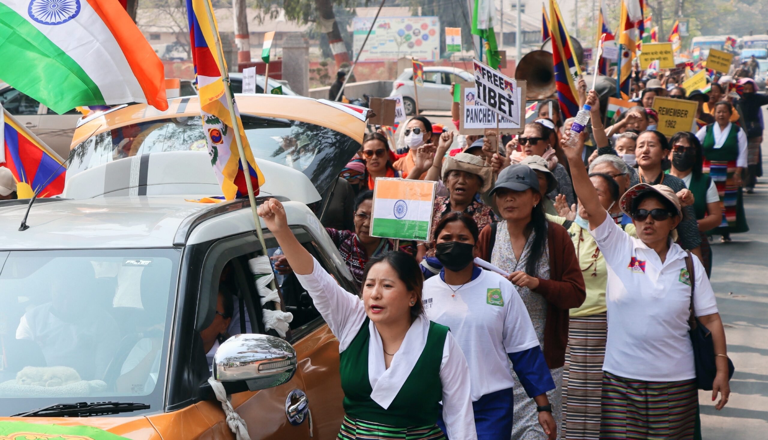 तिब्बती महिलाओं ने 64 वीं वर्षगांठ पर चीन द्वारा तिब्बत पर कब्जा करने और अमानवीय व्यवहार करने को लेकर विरोधस्वरूप निकला जुलूस