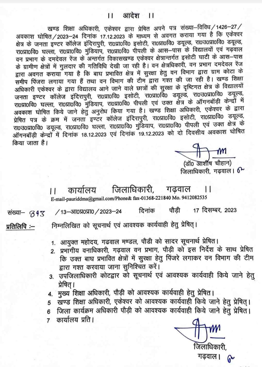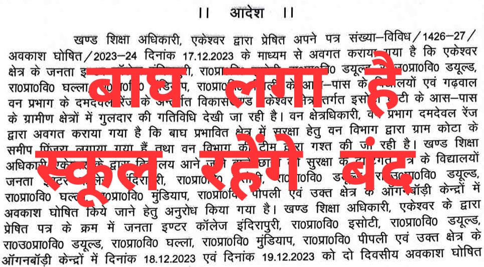 खण्ड शिक्षा अधिकारी,एकेश्वर द्वारा प्रेषित अपने पत्र संख्या-विविध/1426-27/ अवकाश घोषित/2023-24 दिनांक 17.12.2023 के माध्यम से अवगत कराया गया है कि एकेश्वर क्षेत्र के जनता इण्टर कॉलेज इंदिरापुरी, रा०प्रा०वि० इसोटी, रा०प्रा०वि० डयूल्ड, रा०उ०प्रा०वि० डयूल्ड, रा०प्रा०वि० घल्ला, रा०प्रा०वि० मुंडियाप, रा०प्रा०वि० पीपली के आस-पास के विद्यालयों एवं गढ़वाल वन प्रभाग के दमदेवल रेंज के अन्तर्गत विकासखण्ड एकेश्वर क्षेत्रान्तर्गत इसोटी घाटी के आस-पास के ग्रामीण क्षेत्रों में गुलदार की गतिविधि देखी जा रही है।