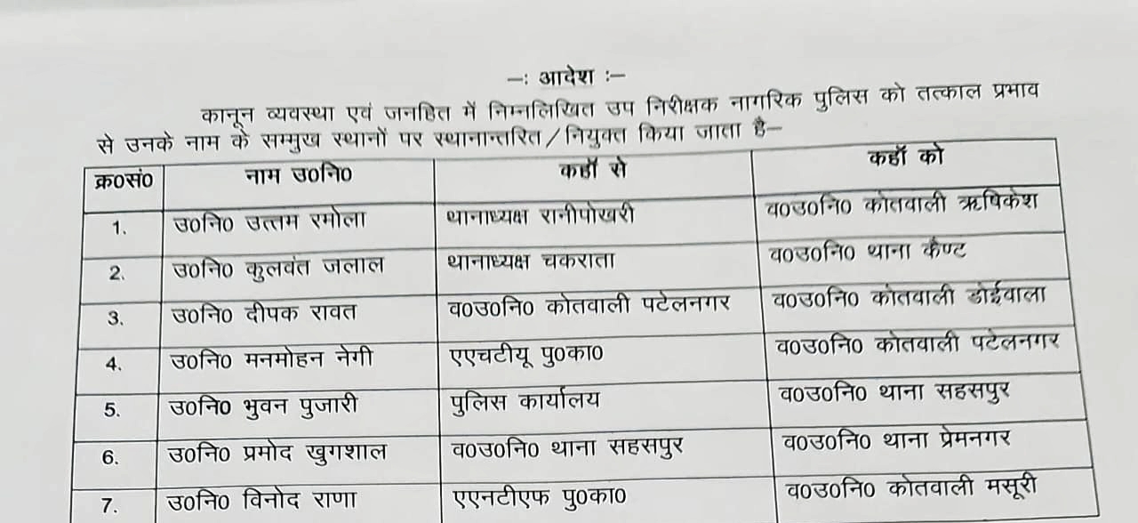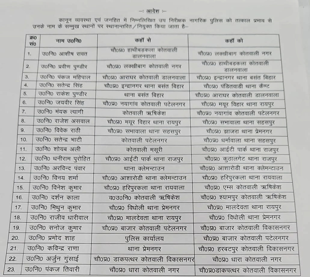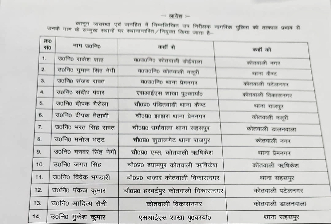 प्रदेश की राजधानी देहरादून में कानून को चुस्त दुरुस्त रखने के लिए एसएसपी अजय सिंह ने 6 इंस्पेक्टर और 50 सब इंस्पेक्टर किए इधर से उधर