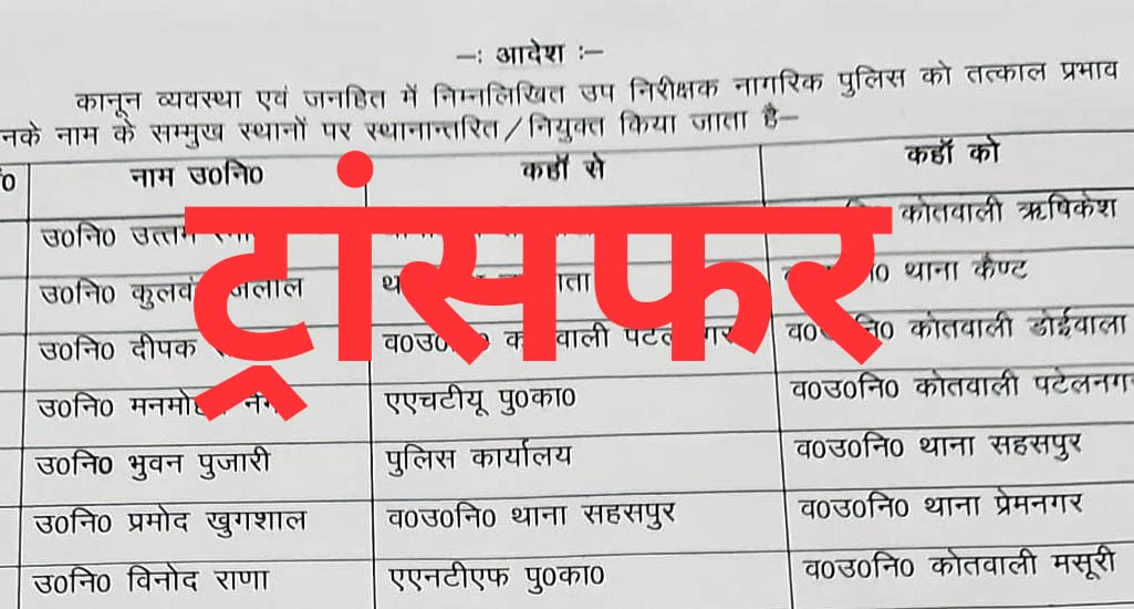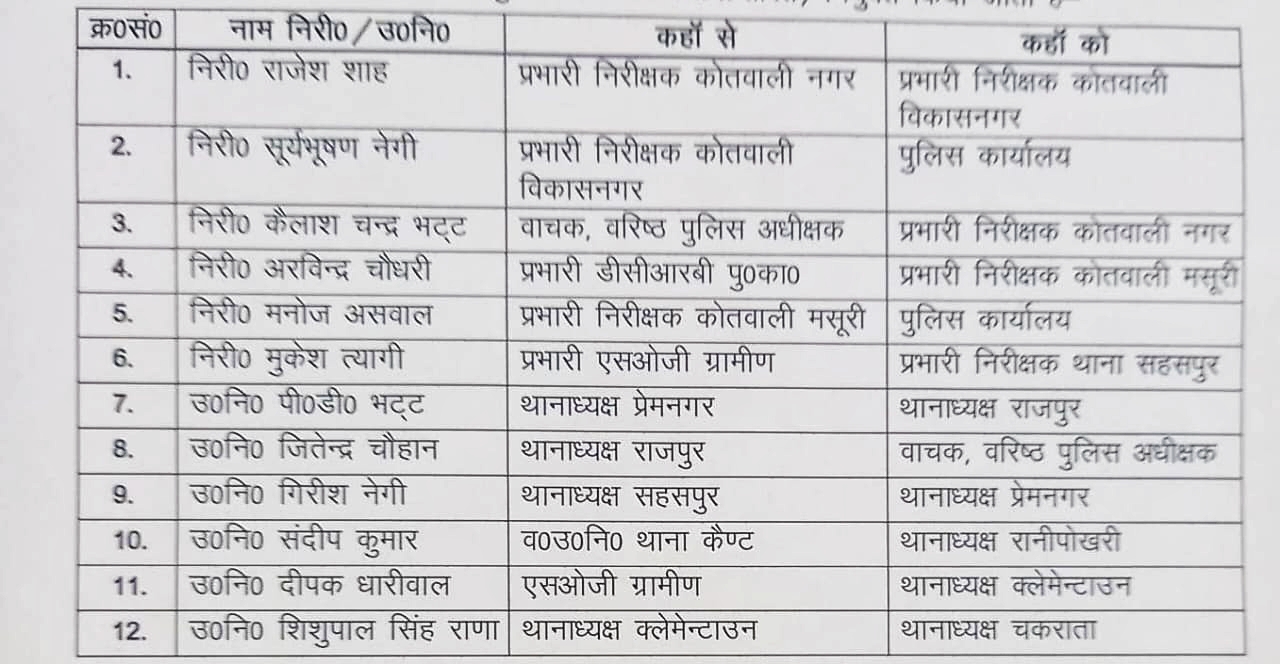 प्रदेश की राजधानी देहरादून में कानून व्यवस्था को चुस्त दुरुस्त रखने के लिए एसएसपी अजय सिंह ने आधा दर्जन इंस्पेक्टर और 50 सब इंस्पेक्टर क्षेत्र में किए स्थानांतरण। उन्होंने सभी को तत्काल प्रभाव से अपनी ड्यूटी ज्वाइन करने के निर्देश भी साथ साथ किए हैं। मालूम हो कि अजय सिंह उत्तराखंड के तेजतर्रार पुलिस अफसरों में गिने जाते हैं और अपने कर्मियों की कोताही कतई बर्दाश्त नहीं करते।आप भी देखिए ट्रांसफर की सूची..