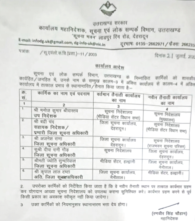 वहीं अतिरिक्त जिला सूचना अधिकारी कृपाल लाल टम्टा को नैनीताल से हटाकर हल्द्वानी मीडिया सेंटर की जिम्मेदारी दी गई है।