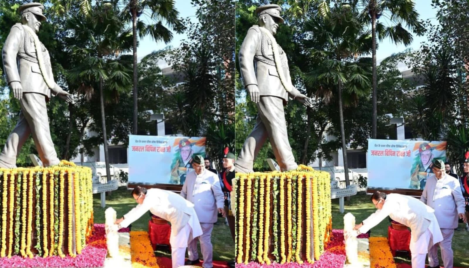 मुख्यमंत्री पुष्कर सिंह धामी ने सोमवार को देहरादून के कनक चौक स्थित पार्क में भारत के प्रथम चीफ ऑफ डिफेंस स्टाफ स्व. जनरल बिपिन रावत की चतुर्थ पुण्यतिथि पर उनकी प्रतिमा पर पुष्पचक्र अर्पित कर श्रद्धांजलि दी।