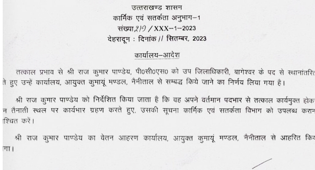 उत्तराखंड शासन द्वारा कुमाऊं मंडल के बागेश्वर जिले में तैनात दो पीसीएस अफसरों को हटा दिया गया है।