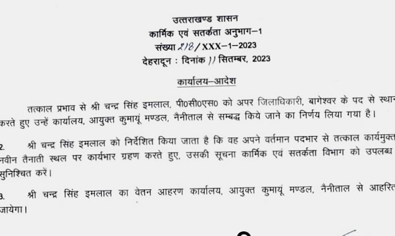 प्राप्त जानकारी का अनुसार बागेश्वर जिले में तैनात एडीएम चंद्रलाल इमलाल व एसडीएम रामकुमार पांडे को शासन के कार्मिक विभाग ने जिले की जिम्मेदारी से हटा कुमाऊ कमिश्नर दीपक रावत के दफ्तर से अटैच कर दिया है।