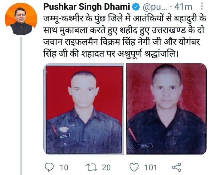 मुख्यमंत्री पुष्कर सिंह धामी ने जम्मू-कश्मीर के पुंछ जिले में आतंकी मुठभेड़ के दौरान उत्तराखंड के दो जवानों के शहीद होने पर गहरा शोक व्यक्त किया है।