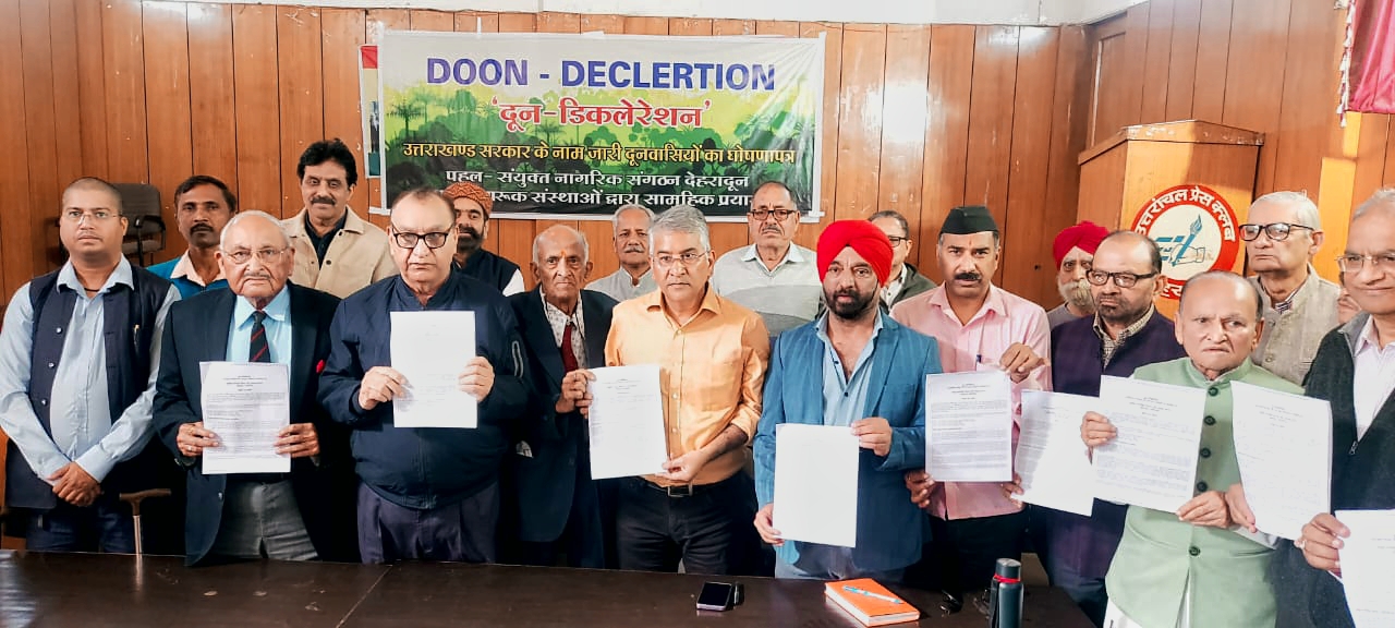 सामाजिक कार्यकर्ता अनूप नौटियाल ने बताया कि दून को लेकर चिंता करने वाले जागरूक लोगों को 2 नवंबर को संगठन की ओर से आयोजित बैठक में बुलाया गया था। इसमें उत्साहजनक यह रहा कि डेढ़ दर्जन से ज्यादा संगठनों-संस्थाओं के प्रतिनिधि उक्त बैठक में शामिल हुए। इसी में तय किया गया था कि नागरिकों की ओर से दून डिक्लेरेशन जारी किया जाएगा।