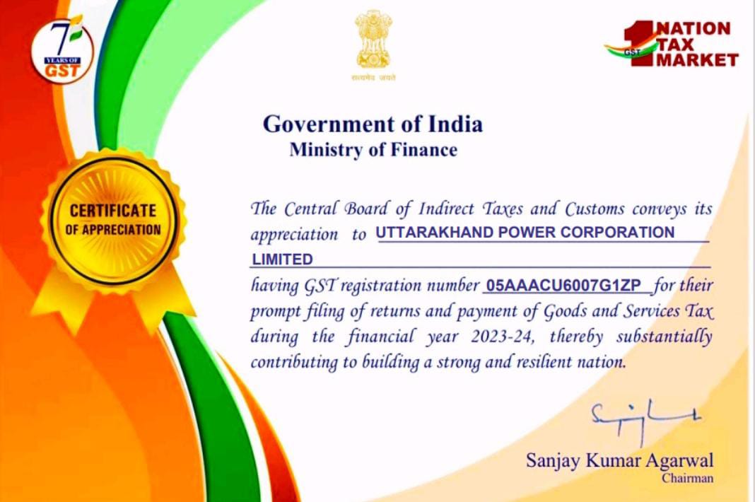 उत्तराखण्ड पावर कारपोरेषन लि. (यूपीसीएल) को केन्द्रीय अप्रत्यक्ष कर एवं सीमा षुल्क बोर्ड (सीबीआईसी) वित्त मंत्रालय, भारत सरकार द्वारा इस वर्श ‘जीएसटी दिवस‘ के अवसर पर “सर्टिफिकेट ऑफ एप्रिशिएशन” द्वारा पुरस्कृत किया गया है।