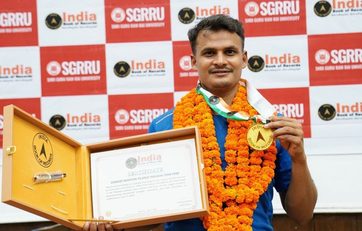 श्री गुरु राम राय विश्वविद्यालय के स्कूल आॅफ योगिक साइंस एण्ड नैचुरोपैथी के छात्र उत्तम अग्रहरि ने राष्ट्रीय रिकाॅर्ड बनाया है। उन्होंने मंगलवार सुबह ताड़ासन की एक ही मुद्रा में लगातार 3 घण्टे 3 मिनट तक खड़े रहकर यह उपलब्धि हासिल की। इण्डिया बुक आॅफ रिकाॅर्डस में उत्तम का यह रिकाॅर्ड दर्ज किया गया। इण्डिया बुक आॅफ रिकाॅर्डस की प्रतिनिधि डाॅॅ श्वेता झा की माॅजूूदगी में राष्ट्रीय रिकार्ड की रिकार्डिंग दर्ज की।