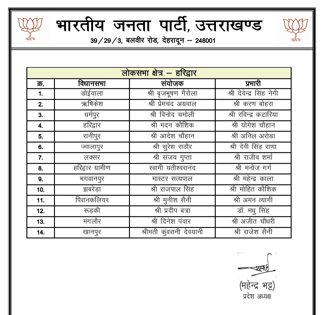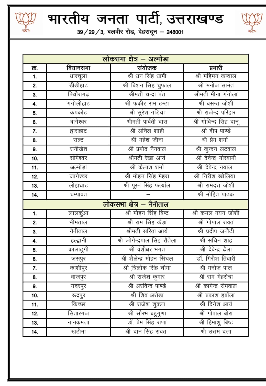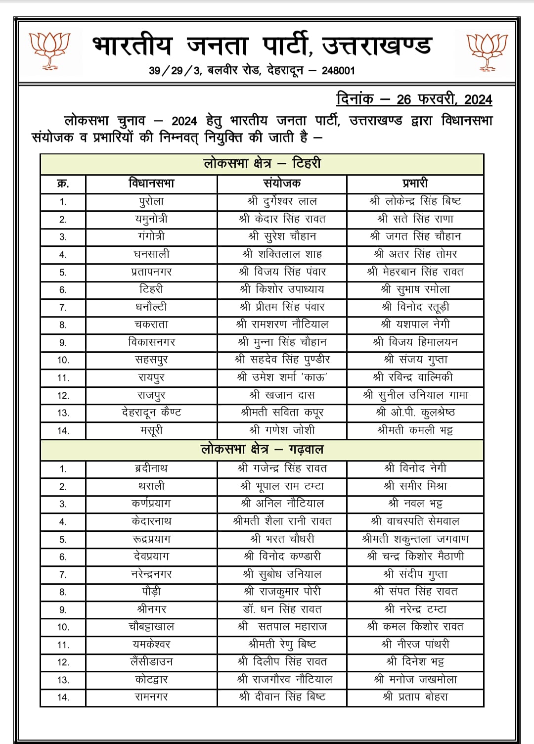 भाजपा ने आगामी लोकसभा चुनाव तैयारियों को आगे बढ़ाते हुए सभी 70 विधानसभा क्षेत्रों में संयोजक और प्रभारी घोषित कर दिये है।