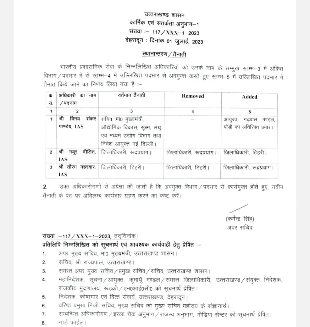 आईएएस विनय शंकर पांडे को गढ़वाल कमिश्नर की जिम्मेदारी दी गई है। इसके अलावा आईएएस मयूर दीक्षित को टिहरी का नया जिलाधिकारी बनाया है जबकि टिहरी के जिलाधिकारी सौरभ गहरवार को रुद्रप्रयाग का नया जिलाधिकारी बनाया गया है।