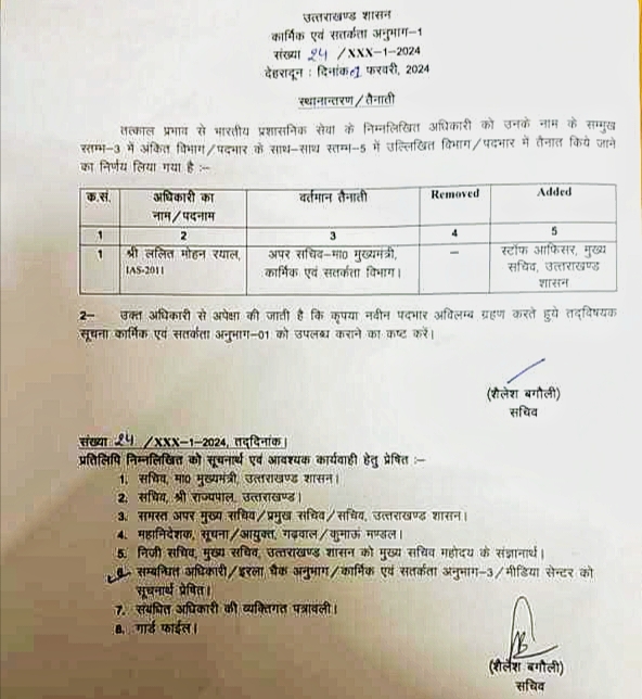 आपको बता दें कि ललित मोहन रयाल IAS- 2011 की वर्तमान तैनाती अपर सचिव मुख्यमंत्री कार्मिक एवं सतर्कता विभाग/ स्टाफ ऑफिसर मुख्य सचिव उत्तराखंड शासन।
