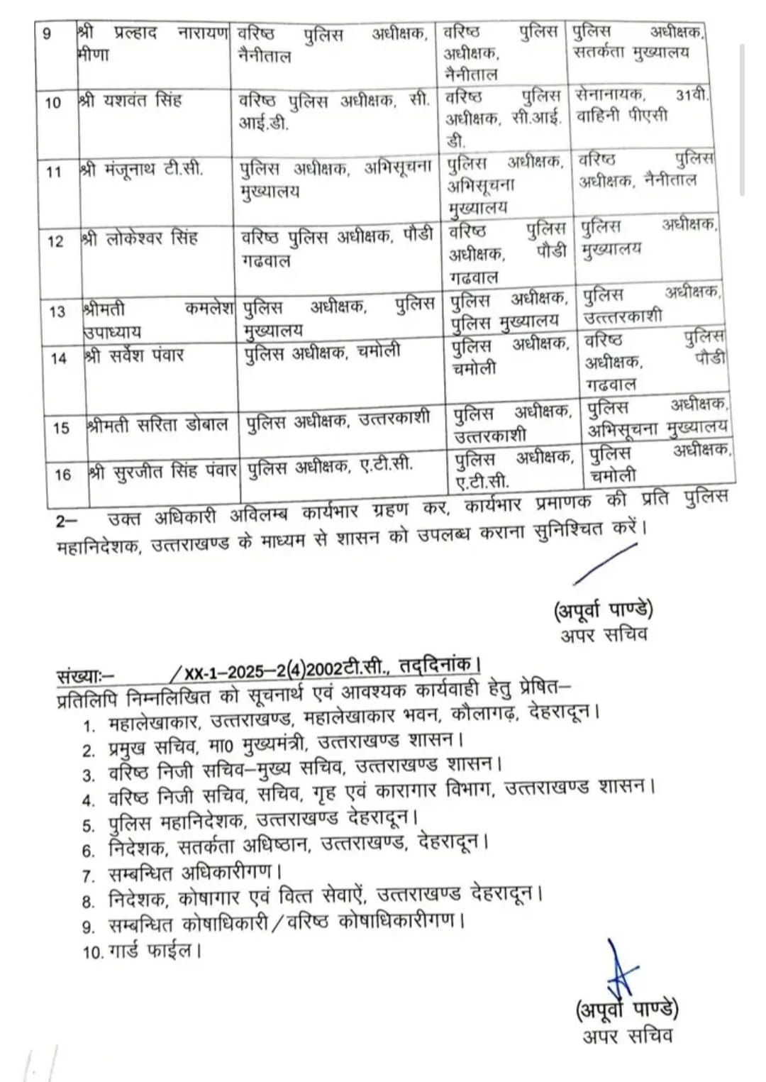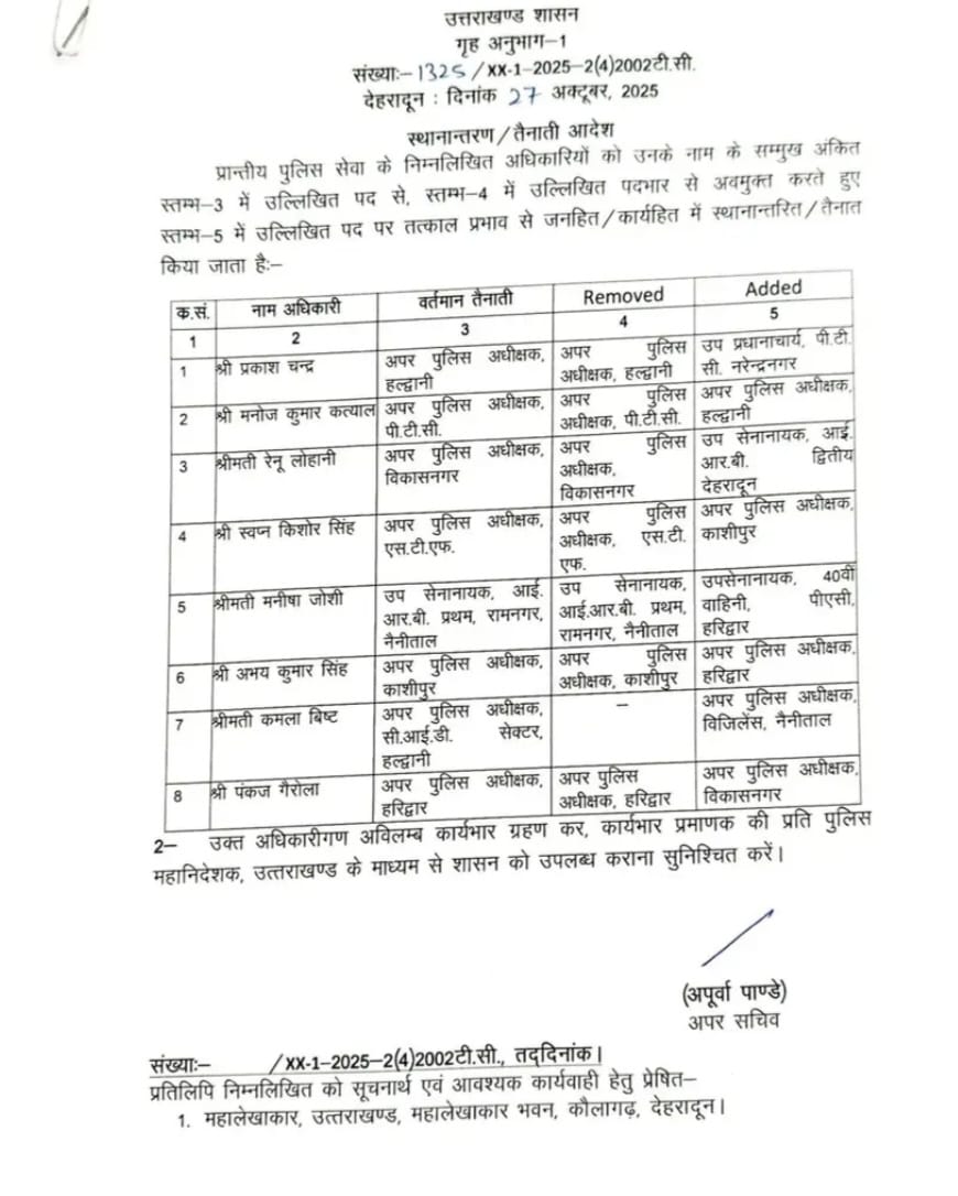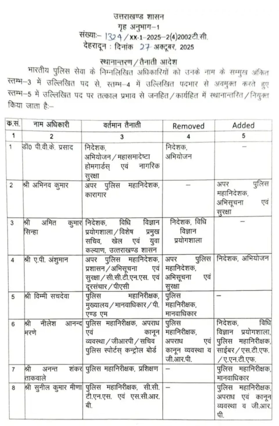 उत्तराखंड पुलिस विभाग में बड़े स्तर पर प्रशासनिक फेरबदल किए गए हैं जिसके अंतर्गत शासन ने 16 आईपीएस (IPS) और 8 पीपीएस (PPS) अधिकारियों के तबादले के आदेश जारी किए है।
